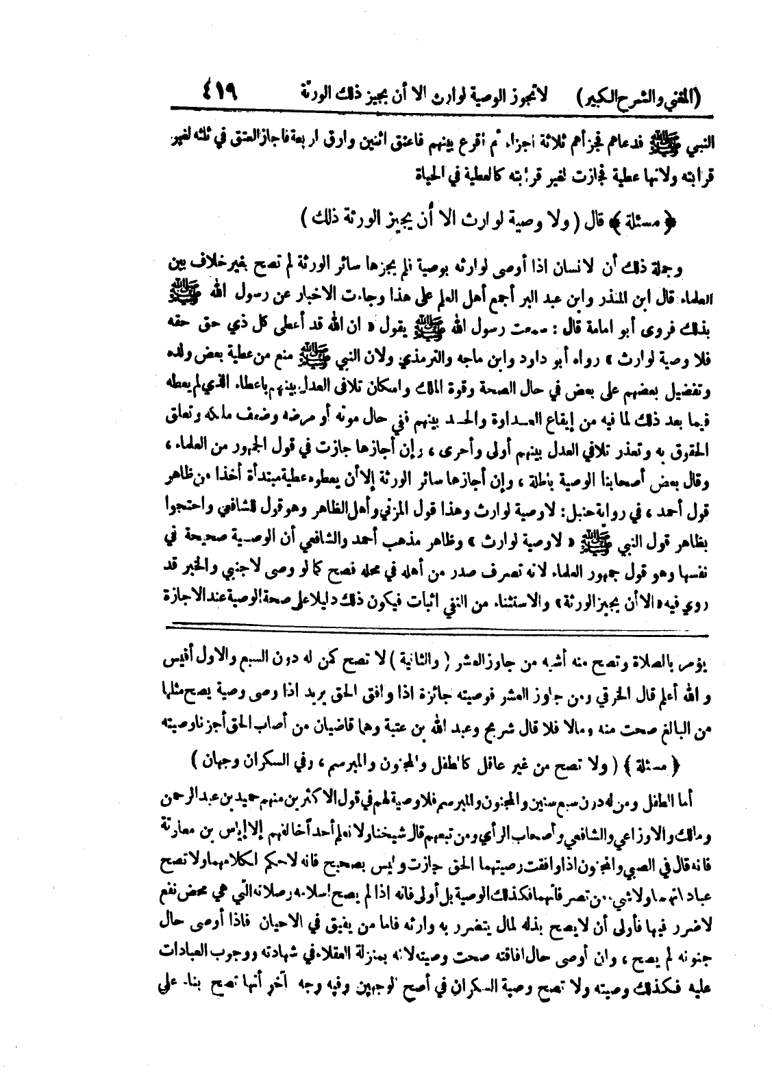 يؤمر بالصلاة وتصح منه أشبه من جاوز العشر (والثانية) لا تصح كمن له دون السبع والأول أقيس والله أعلم قال الخرقي ومن جاوز العشر فوصيته جائزة إذا وافق الحق يريد إذا وصى وصية يصح مثلها من البالغ صحت منه ومالا فلا قال شريح وعبد الله بن عتبة وهما قاضيان من أصاب الحق أجزنا وصيته * (مسألة) * (ولا تصح من غير عاقل كالطفل والمجنون والمبرسم، وفي السكران وجهان) أما الطفل ومن له دون سبع سنين والمجنون والمبرسم فلا وصية لهم في قول الأكثرين منهم حميد بن عبد الرحمن ومالك والاوزاعي والشافعي وأصحاب الرأي ومن تبعهم قال شيخنا ولا نعلم احداً خالفهم إلا إياس بن معاوتة فإنه قال في الصبي والمجنون إذا وافقت وصيتهما الحق جازت وليس بصحيح فإنه لا حكم لكلامهما ولا تصح عبداتهما ولا شئ من تصرفاتهما فكذلك الوصية بل أولى فإنه إذا لم يصح إسلامه وصلاته التي هي محض نفع لا ضرر فيها فأولى أن لا يصح بذله لمال يتضرر به وارثه فأما من يفيق في الأحيان فإذا أوصى حال جنونه لم يصح، وإن أوصى حال إفاقته صحت وصيته لأنه بمنزلة العقلاء في شهادته ووجوب العبادات عليه فكذلك وصيته ولا تصح وصية السكران في أصح الوجهين وفيه وجه آخر أنها تصح بناء على