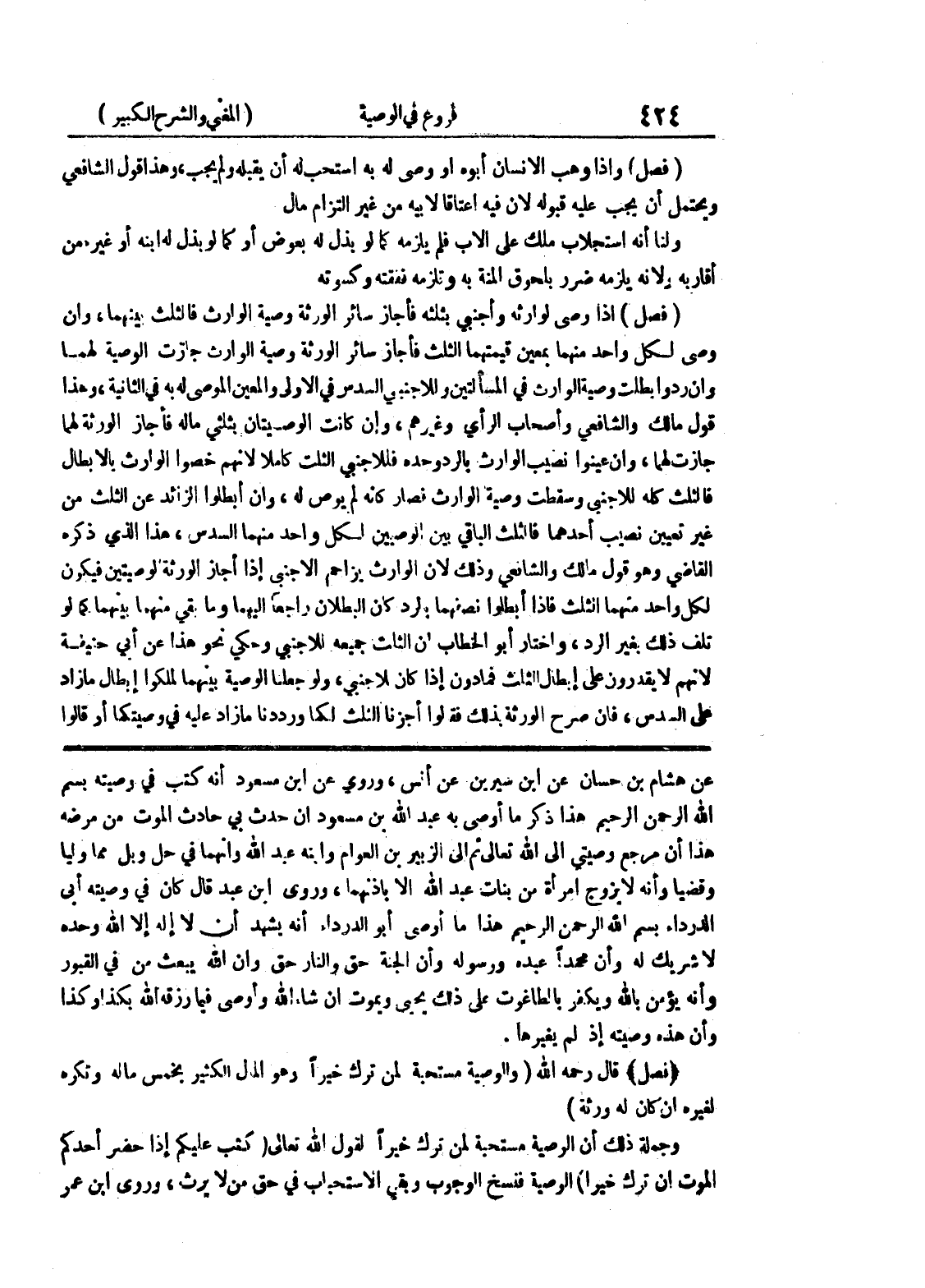 عن هشام بن حسان عن ابن سيرين عن أنس، وروي عن ابن مسعود أنه كتب في وصيته بسم الله الرحمن الرحيم هذا ذكر ما أوصى به عبد الله بن مسعود إن حدث بي حادث الموت من مرضه هذا أن مرجع وصيتي إلى الله تعالى ثم إلى الزبير بن العوام وابنه عبد الله وأنهما في حل وبل مما وليا وقضيا وأنه لا يزوج امرأة من بنات عبد الله ألا بإذنهما، وروى ابن عبد قال كان في وصيته أبي الدرداء بسم الله الرحمن الرحيم هذا ما أوصى أبو الدرداء أنه يشهد أن لا إله إلا الله وحده لا شريك له وأن محمداً عبده ورسوله وأن الجنة حق والنار حق وأن الله يبعث من في القبور وأنه يؤمن بالله ويكفر بالطاغوت على ذلك يحيى ويموت إن شاء الله وأوصى فيما رزقه الله بكذا وكذا وأن هذه وصيته إذ لم يغيرها.