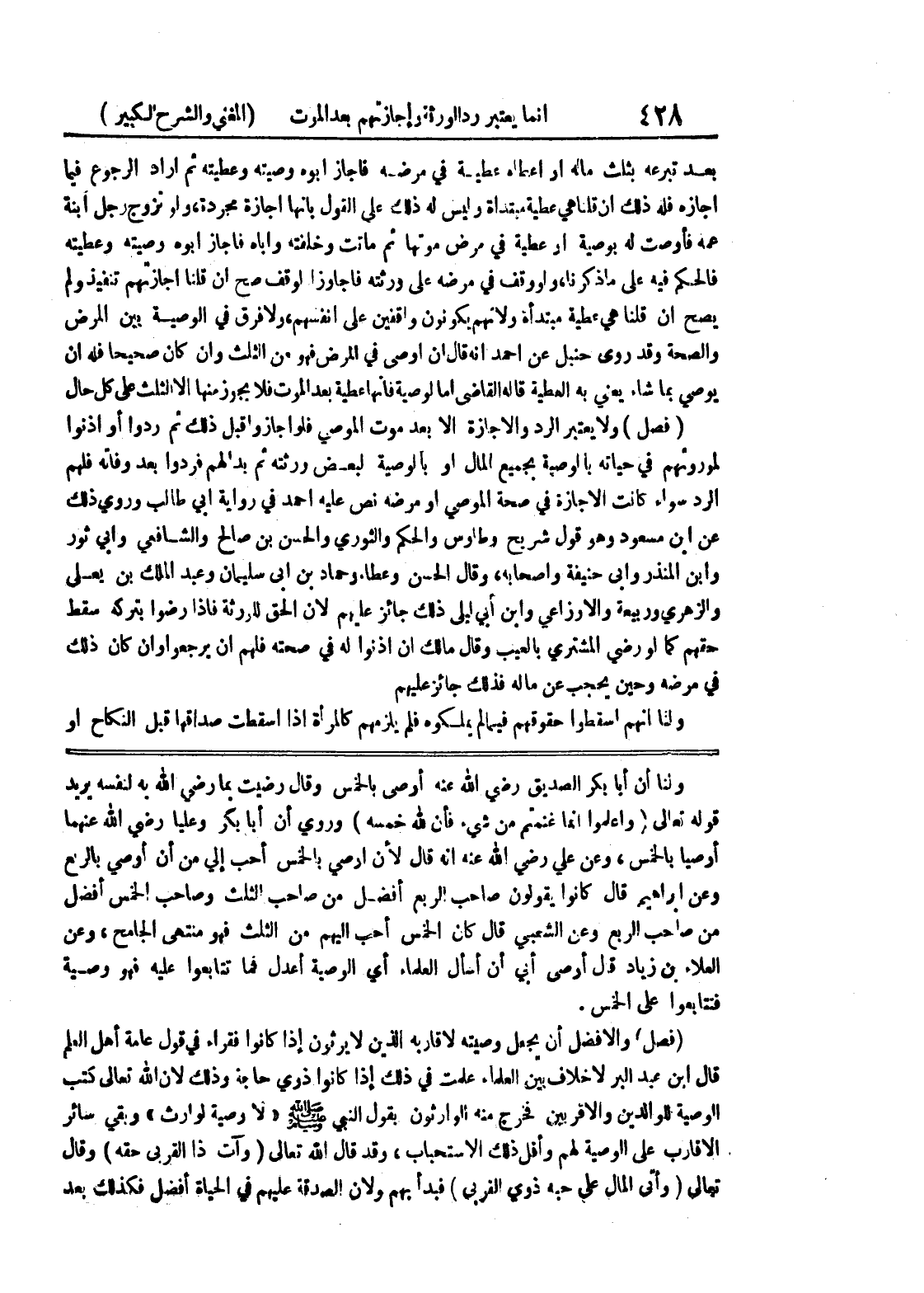 ولنا أن أبا بكر الصديق رضي الله عنه أوصى بالخمس وقال رضيت بما رضي الله به لنفسه يريد قوله تعالى (واعلموا انما غنتم من شئ فأن لله خمسه) وروي أن أبا بكر وعلياً رضي الله عنهما أوصيا بالخمس، وعن علي رضي الله عنه أنه قال لأن أوصي بالخمس أحب إلي من أن أوصي بالربع وعن إبراهيم قال كانوا يقولون صاحب الربع أفضل من صاحب الثلث وصاحب الخمس أفضل من صاحب الربع وعن الشعبي قال كان الخمس أحب إليهم من الثلث فهو منتهى الجامح، وعن العلاء بن زياد قال أوصى أبي أن أسأل العلماء أي الوصية أعدل فما تتابعوا عليه فهو وصية فتتابعوا على الخمس.