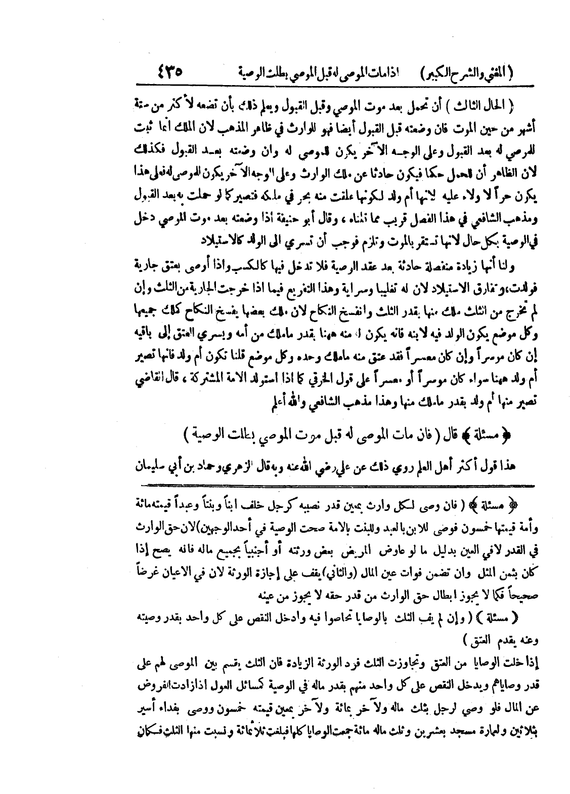 * (مسألة) * (فإن وصى لكل وارث بمعين قدر نصيبه كرجل خلف ابناً وبنتاً وعبداً قيمته مائة وأمة قيمتها خمسون فوصى للابن بالعبد وللبنت بالأمة صحت الوصية في أحد الوجهين) لأن حق الوارث في القدر لا في العين بدليل ما لو عاوض المريض بعض ورثته أو أجنبياً بجميع ماله فإنه يصح إذا كان بثمن المثل وإن تضمن فوات عين المال (والثاني) يقف على إجازة الورثة لأن في الأعيان غرضاً صحيحاً فكما لا يجوز إبطال حق الوارث من قدر حقه لا يجوز من عينه * (مسألة) * (وإن لم يف الثلث بالوصايا تحاصوا فيه وادخل النقص على كل واحد بقدر وصيته وعنه يقدم العتق) إذا خلت الوصايا من العتق وتجاوزت الثلث فرد الورثة الزيادة فإن الثلث يقسم بين الموصى لهم على