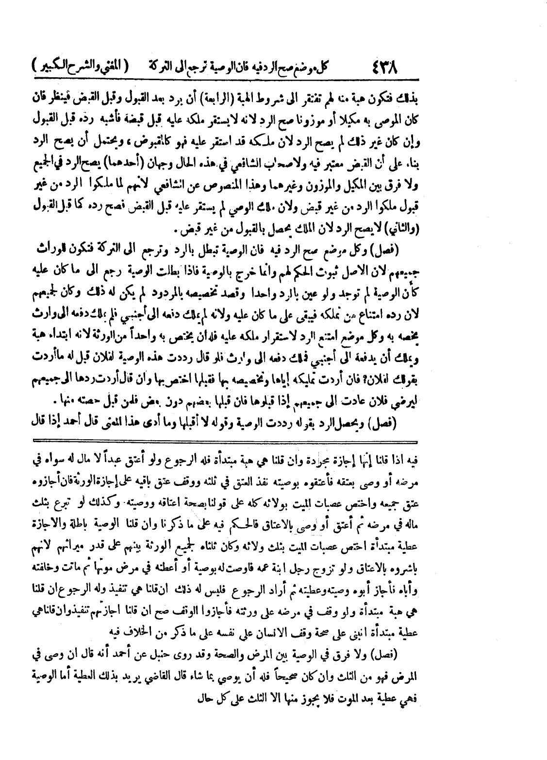 فيه إذا قلنا إنها إجازة مجردة وإن قلنا هي هبة مبتدأة فله الرجوع ولو أعتق عبدًا لا مال له سواه في مرضه أو وصى بعتقه فأعتقوه بوصيته نفذ العتق في ثلثه ووقف عتق باقيه على إجازة الورثة فإن أجازوه عتق جميعه واختص عصبات الميت بولائه كله على قولنا بصحة إعتاقه ووصيته وكذلك لو تبرع بثلث ماله في مرضه ثم أعتق أو وصى بالإعتاق فالحكم فيه على ما ذكرنا وإن قلنا الوصية باطلة والإجازة عطية مبتدأة اختص عصبات الميت بثلث ولائه وكان ثلثاه لجميع الورثة بينهم على قدر ميراثهم لأنهم باشروه بالإعتاق ولو تزوج رجل ابنة عمه فأوصت له بوصية أو أعطته في مرض موتها ثم ماتت وخلفته وأباه فأجاز أبوه وصيته وعطيته ثم أراد الرجوع فليس له ذلك إن قلنا هي تنفيذ وله الرجوع إن قلنا هي هبة مبتدأة ولو وقف في مرضه على ورثته فأجازوا الوقف صح إن قلنا إجازتهم تنفيذ وإن قلنا هي عطية مبتدأة انبنى على صحة وقف الإنسان على نفسه على ما ذكر من الخلاف فيه (فصل) ولا فرق في الوصية بين المرض والصحة وقد روى حنبل عن أحمد أنه قال إن وصى في المرض فهو من الثلث وإن كان صحيحاً فله أن يوصي بما شاء قال القاضي يريد بذلك العطية أما الوصية فهي عطية بعد الموت فلا يجوز منها إلا الثلث على كل حال