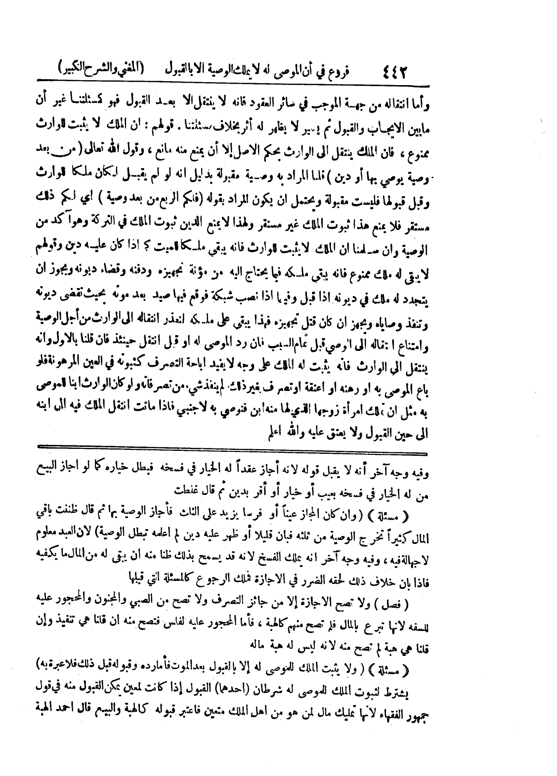 وفيه وجه آخر أنه لا يقبل قوله لأنه أجاز عقداً له الخيار في فسخه فبطل خياره كما لو أجاز البيع من له الخيار في فسخه بعيب أو خيار أو أقر بدين ثم قال غلطت * (مسألة) * (وإن كان المجاز عيناً أو فرساً يزيد على الثلث فأجاز الوصية بها ثم قال ظننت باقي المال كثيراً تخرج الوصية من ثلثه فبان قليلاً أو ظهر عليه دين لم اعلمه تبطلل الوصية) لأن العبد معلوم لا جهالة فيه، وفيه وجه آخر أنه يملك الفسخ لأنه قد يسمح بذلك ظناً منه أن يبقى له من المال ما يكفيه فإذا بأن خلاف ذلك لحقه الضرر في الإجازة فملك الرجوع كالمسألة التي قبلها (فصل) ولا تصح الإجازة إلا من جائز التصرف ولا تصح من الصبي والمجنون والمحجور عليه للسفه لأنها تبرع بالمال فلم تصح منهم كالهبة، فأما المحجور عليه لفلس فتصح منه إن قلنا هي تنفيذ وإن قلنا هي هبة لم تصح منه لأنه ليس له هبة ماله * (مسألة) * (ولا يثبت الملك للموصى له إلا بالقبول بعد الموت فأما رده وقبوله قبل ذلك فلا عبرة به)