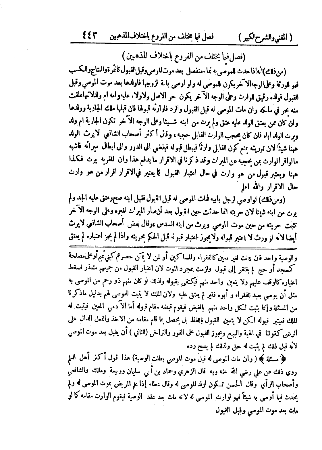 والوصية واحد فإن كانت لغير معنى كالفقراء والمساكين أو لمن لا يمكن حصرهم كبني تميم أو على مصلحة كمسجد أو حج لم يفتقر إلى قبول ولزمت بمجرد الموت لأن اعتبار القول من جميعهم متعذر فسقط اعتباره كالوقف عليهم ولا يتعين واحد منهم فيكتفي بقبوله ولذلك لو كان منهم ذو رحم من الموصى به مثل أن يوصي بعبد للفقراء وأبوه فقير لم يعتق عليه ولأن الملك لا يثبت للموصى لهم بدليل ما ذكرنا من المسألة وإنما يثبت لك واحد منهم بالقبض فيقوم قبضه مقام قبوله أما الآدمي المعين فيثبت له الملك فعيتبر قبوله لكن لا يتعين القبول باللفظ بل يحصل بما قام مقامه من الأخذ والفعل الدال على الرضى كقولنا في الهبة والبيع ويجوز القبول على الفور والتراخي (الثاني) أن يقبل بعد موت الموصي لأنه قبل ذلك لم يثبت له حق ولذلك لم يصح رده * (مسألة) * (وإن مات الموصى له قبل موت الموصي بطلت الوصية) هذا قول أكثر أهل العلم روي ذلك عن علي رضي الله عنه وبه قال الزهري وحماد بن أبي سليمان وربيعة ومالك والشافعي وأصحاب الرأي وقال الحسن تكون لولد الموصى له وقال عطاء إذا علم المريض بموت الموصى له ولم يحدث فيما أوصى به شيئاً فهو لوارث الموصى له لأنه مات بعد عقد الوصية فيقوم الوارث مقامه كما لو مات بعد موت الموصي وقبل القبول