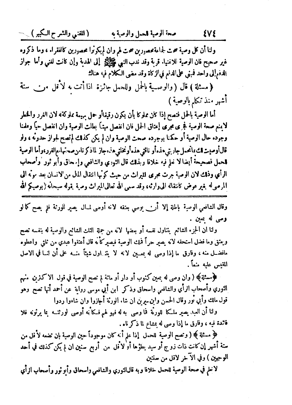 * (مسألة) * (وتصح الوصية للحمل إذا علم أنه كان موجوداً حين الوصية بأن تضعه لأقل من ستة أشهر إن كانت ذات زوج أو سيد يطؤها أو لأقل من أربع سنين إن لم يكن كذلك في أحد الوجهين) وفي الآخر لأقل من سنتين لا نعلم في صحة الوصية للحمل خلافاً وبه قال الثوري والشافعي واسحاق وأبو ثور وأصحاب الرأي