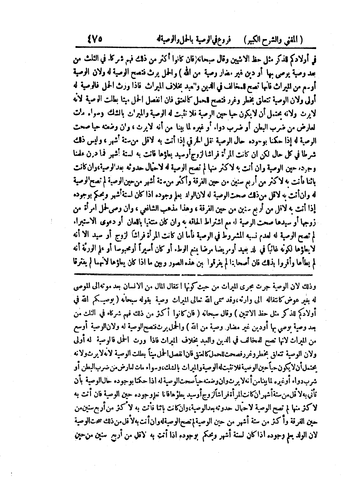 وذلك لأن الوصية جرت مجرى الميراث من حيث كونها انتقال المال من الإنسان بعد موته إلى الموصى له بغير عوض كانتقاله إلى وارثه، وقد سمى الله تعالى الميراث وصية بقوله سبحانه (يوصيكم الله في أولادكم للذكر مثل حظ الاثنين) وقال سبحانه (فإن كانوا أكثر من ذلك فهم شركاء في الثلث من بعد وصية يوصى بها أو دين غير مضار وصية من الله) والحمل يرث فتصح الوصية له ولأن الوصية أوسع من الميراث لأنها تصح للمخالف في الدين والعبد بخلاف الميراث فإذا ورث الحمل فالوصية له أولى ولأن الوصية تتعلق بخطر وغرر فصحت للحمل كالعتق فإن انفصل الحمل ميتاً بطلت الوصية لأنه لا يرث ولأنه يحتمل أن لا يكون حياً حين الوصية فلا تثبت له الوصية والميراث بالشك، وسواء مات لعارض من ضرب البطن أو شرب دواء أو غيره لما بينا من أنه لا يرث وإن وضعته حياً صحت الوصية له إذا حكمنا بوجوده حال الوصية بأن تأتي به لأقل من ستة أشهر ان كانت المرأة فراشاً لزوج أو سيد يطؤها فإنا نعلم وجوده حين الوصية فإن أتت به لأكثر منها لم تصح الوصية لاحتمال حدوثه بعد الوصية، وإن كانت بائناً فأتت به لأكثر من أربع سنين من حين الفرقة وأكثر من ستة أشهر من حين الوصية لم تصح الوصية له وإن أتت به لأقل من ذلك صحت الوصية