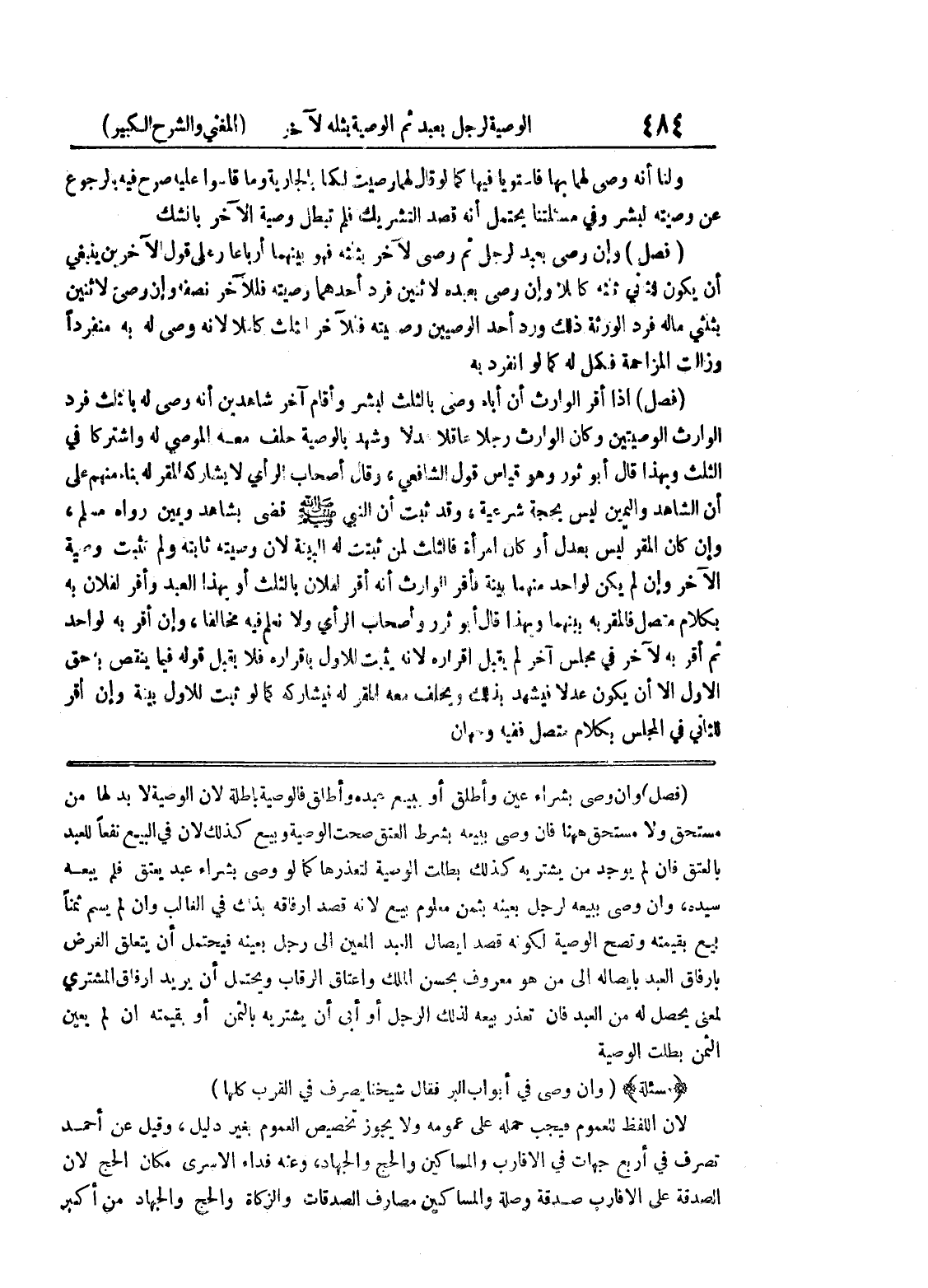 (فصل) وإن وصى بشراء عين وأطلق أو ببيع عبده وأطلق فالوصية باطلة لأن الوصية لا بد لها من مستحق ولا مستحق ههنا فإن وصى ببيعه بشرط العتق صحت الوصية وبيع كذلك لأن في البيع نفعاً للعبد بالعتق فإن لم يوجد من يشتريه كذلك بطلت الوصية لتعذرها كما لو وصى بشراء عبد يعتق فلم يبعه سيده، وإن وصى ببيعه لرجل بعينه بثمن معلوم بيع لأنه قصد إرفاقه بذلك في الغالب وإن لم يسم ثمناً بيع بقيمته وتصح الوصية لكونه قصد إيصال العبد المعين إلى رجل بعينه فيحتمل أن يتعلق الغرض
