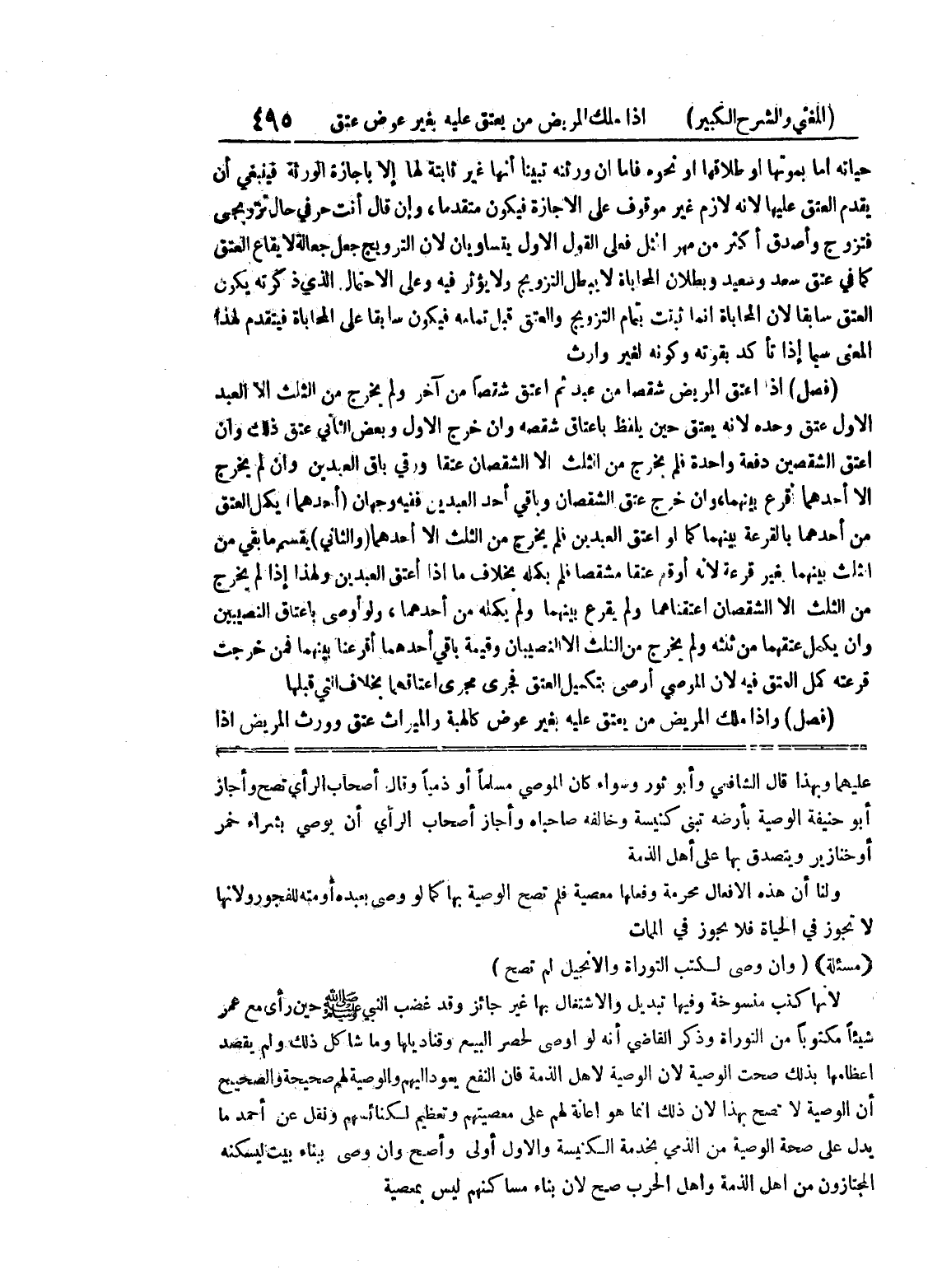 عليهما وبهذا قال الشافعي وابو ثور وسواء كان الموصي مسلماً أو ذمياً وقال أصحاب الرأي تصح وأجاز أبو حنيفة الوصية بأرضه تبنى كنيسة وخالفه صاحباه وأجاز أصحاب الرأي إن يوصي بشراء خمر أو خنازير ويتصدق بها على أهل الذمة ولنا أن هذه الأفعال محرمة وفعلها معصية فلم تصح الوصية بها كما لو وصى بعبده أو مته للفجور ولأنها لا تجوز في الحياة فلا يجوز في الممات * (مسألة) * (وإن وصى لكتب التوراة والإنجيل لم تصح) لأنها كتب منسوخة وفيها تبدليل والاشتغال بها غير جائز وقد غضب النبي صلى الله عليه وسلم حين رأى مع عمر شيئاً مكتوباً من التوراة وذكر القاضي أنه لو أوصى لحصر البيع وقناديلها وما شاكل ذلك ولم يقصد إعظامها بذلك صحت الوصية لأن الوصية لأهل الذمة فإن النفع يعود إليهم والوصية لهم صحيحة والصحيح أن الوصية لا تصح بهذا لأن ذلك إنما هو إعانة لهم على معصيتهم وتعظيم لكنائسهم ونقل عن أحمد ما يدل على صحة الوصية من الذمي بخدمة الكنيسة والأول أولى وأصح وإن وصى ببناء بيت ليسكنه المجتازون من أهل الذمة وأهل الحرب صح لأن بناء مساكنهم ليس بمعصية