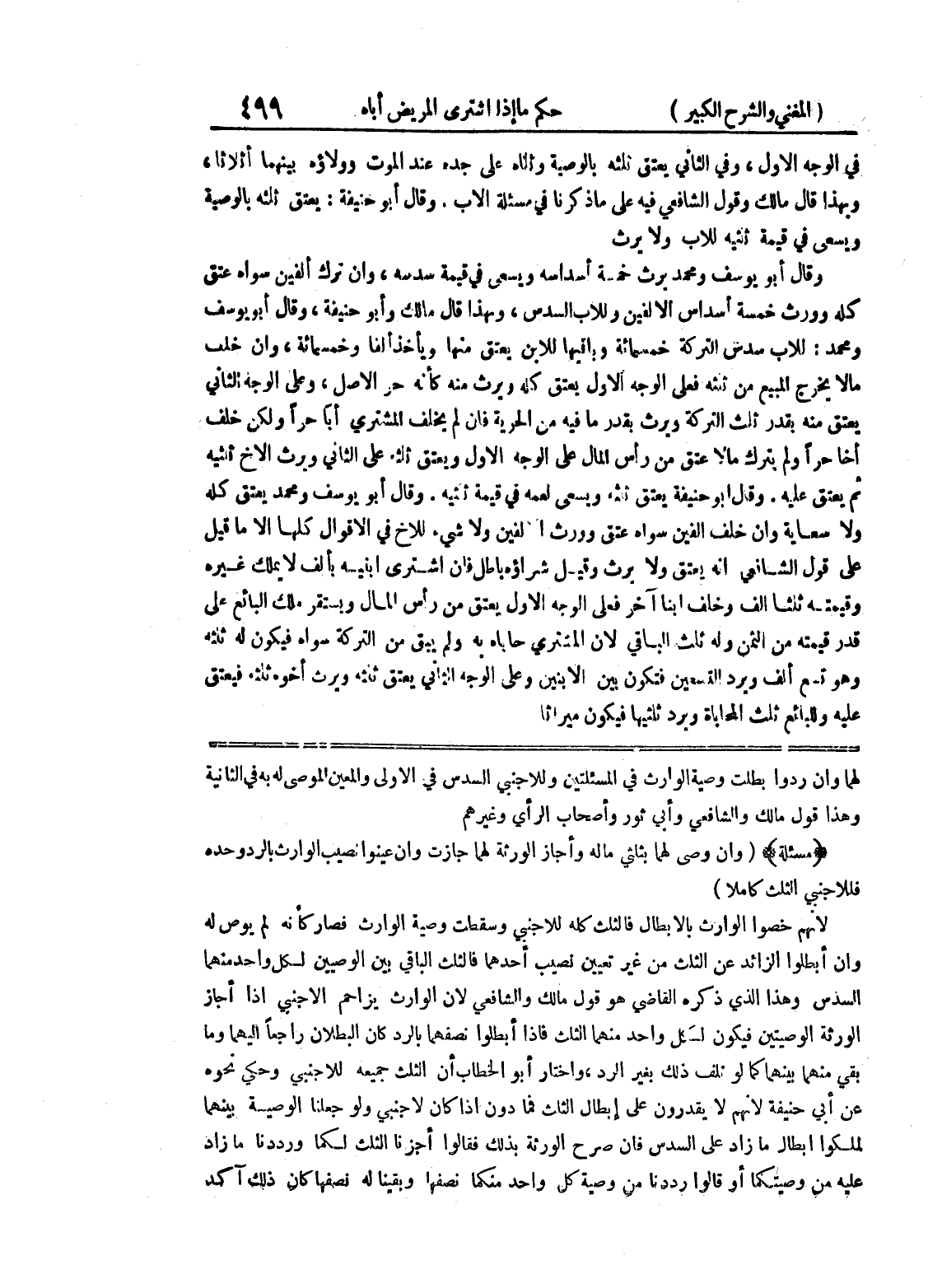 لهما وإن ردوا بطلت وصية الوارث في المسئلتين وللأجنبي السدس في الأولى والمعين الموصى له به في الثانية وهذا قول مالك والشافعي وأبي ثور وأصحاب الرأي وغيرهم * (مسألة) * (وإن وصى لهما بثلثي ماله وأجاز الورثة لهما جازت وإن عينوا نصيب الوارث بالرد وحده فللأجنبي الثلث كاملاً) لأنهم خصوا الوارث بالإبطال فالثلث كله للأجنبي وسقطت وصية الوراث فصار كأنه لم يوص له وإن أبطلوا الزائد عن الثلث من غير تعيين نصيب أحدهما فالثلث الباقي بين الوصيين لكل واحد منهما السدس وهذا الذي ذكره القاضي هو قول مالك والشافعي لأن الوارث يزاحم الأجنبي إذا أجاز الورثة الوصيتين فيكون لكل واحد منهما الثلث فإذا أبطلوا نصفهما بالرد كان البطلان راجعاً إليهما وما