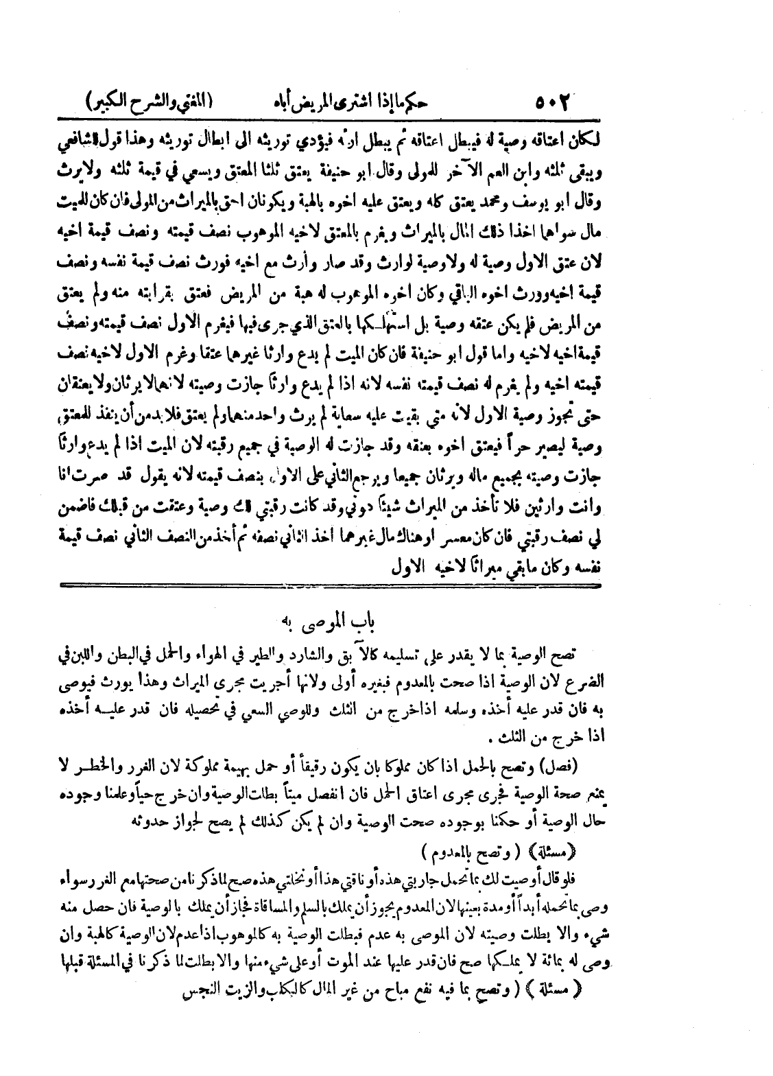باب الموصي به تصح الوصية بما لا يقدر على تسليمه كالآبق والشارد والطير في الهواء والحمل في البطن واللبن في الضرع لأن الوصية إذا صحت بالمعدوم فبغيره أولى ولأنها أجريت مجرى الميراث وهذا يورث فيوصى به فإن قدر عليه أخذه وسلمه إذا خرج من الثلث وللوصي السعي في تحصيله فإن قدر عليه أخذه إذا خرج من الثلث.