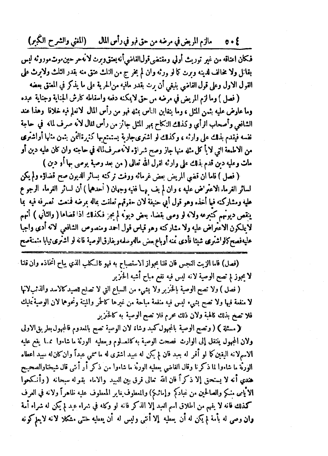 (فصل) فأما الزيت النجس فإن قلنا بجواز الاستصباح به فهو كالكلب الذي يباح اتخاذه وإن قلنا لا يجوز لم تصح الوصية لأنه ليس فيه نفع مباح أشبه الخنزير (فصل) ولا تصح الوصية بالخنزير ولا بشئ من السباع التي لا تصلح للصيد كالأسد والذئب لأنها لا منفعة فيها ولا تصح بشئ ليس فيه منفعة مباحة من غيرها كالخمر والميتة ونحوهما لأن الوصية تمليك فلا تصح بذلك كالهبة ولأن ذلك محرم فلا تصح الوصية به كالخنرير * (مسألة) * (وتصح الوصية بالمجهول كعبد وشاة لأن الوصية تصح بالمعدوم فالمجهول بطريق الأولى ولأن المجهول ينتقل إلى الوراث فصحت الوصية به كالمعلوم ويعطيه الورثة ما شاءوا مما يقع عليه الاسم لأنه اليقين كما لو أقر له بعبد فإن لم يكن له عبيد اشترى له ما سمى عبداً وإن كان له عبيد أعطاه الورثة ما شاءوا لما ذكرنا وقال القاضي يعطيه الورثة ما شاءوا من ذكر أو أنثى قال شيخنا والصحيح عندي أنه لا يستحق إلا ذكراً فإن الله تعالى قرق بين العبيد والإماء بقوله سبحانه (وأنكحوا الأيامى منكم والصالحين من عبادكم وإمائكم) والمعطوف يغاير المعطوف عليه ظاهراً ولأنه في العرف كذلك فإنه لا يفهم من إطلاق اسم العبد إلا الذكر فإنه لو وكله في شراء عبد لم يكن له شراء أمة وإن وصى له بأمة لم يكن له أن يعطيه إلا أنثى وليس له أن يعطيه خنثى مشكلاً لأنه لا يعلم كونه