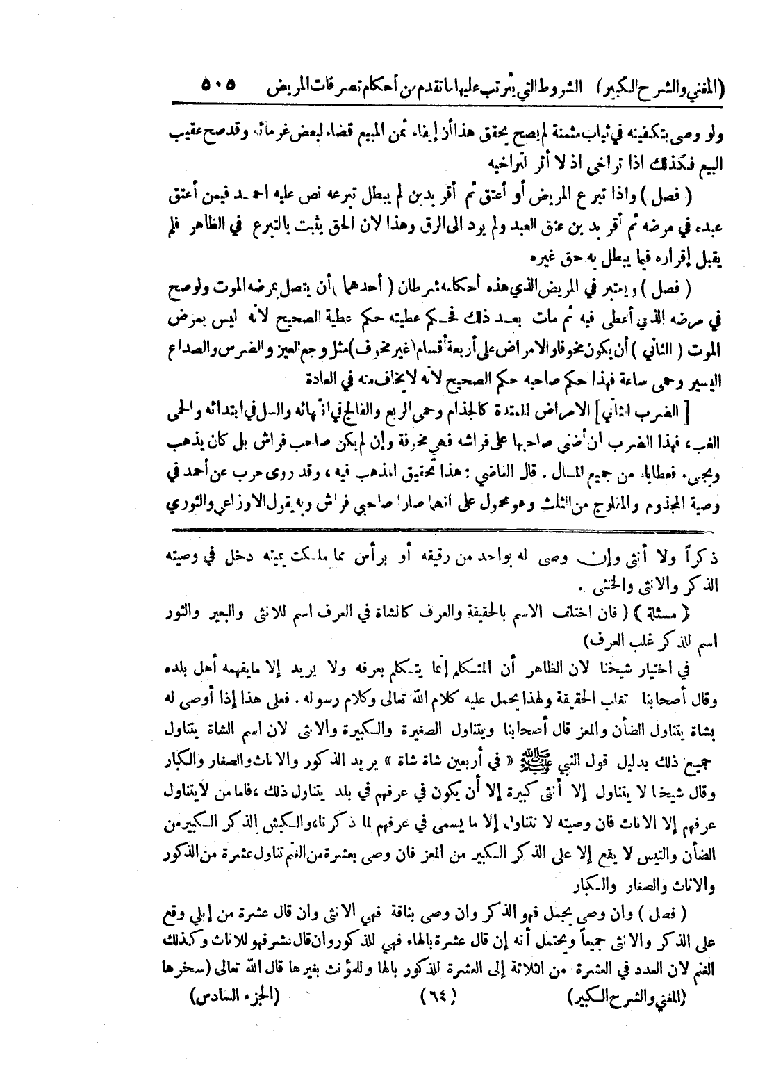 فعلى هذا إذا أوصى له بشاة يتناول الضأن والمعز قال أصحابنا ويتناول الصغيرة والكبيرة والأنثى لأن اسم الشاة يتناول جميع ذلك بدليل قول النبي صلى الله عليه وسلم " في أربعين شاة شاة " يريد الذكور والإناث والصغار والكبار وقال شيخنا لا يتناول إلا أنثى كبيرة إلا أن يكون في عرفهم في بلد يتناول ذلك، فأما من لا يتناول عرفهم إلا الإناث فإن وصيته لا نتناول إلا ما يسمى في عرفهم لما ذكرنا، والكبش الذكر الكبير من الضأن والتيس لا يقع إلا على الذكر الكبير من المعز فإن وصى بعشرة من الغنم تناول عشرة من الذكور والإناث والصغار والكبار (فصل) وإن وصى بجمل فهو الذكر وإن وصى بناقة فهي الأنثى وإن قال عشرة من إبلي وقع على الذكر والأنثى جميعاً ويحتمل أنه إن قال عشرة بالهاء فهي للذكور وإن قال عشر فهو للإناث وكذلك الغنم لأن العدد في العشرة من الثلاثة إلى العشرة للذكور بالها وللمؤنث بغيرها قال الله تعالى (سخرها
