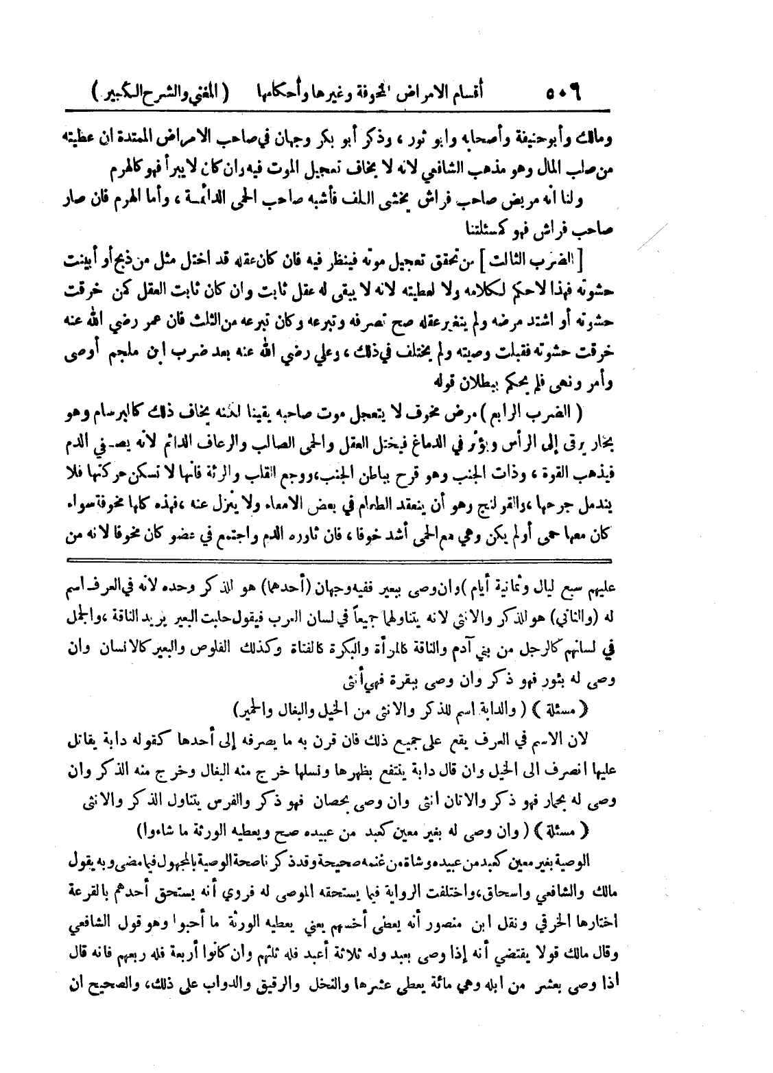 عليهم سبع ليال وثمانية أيام) وإن وصى ببعير ففيه وجهان (أحدهما) هو للذكر وحده لأنه في العرف اسم له (والثاني) هو للذكر والأنثى لأنه يتناولهما جميعاً في لسان العرب فيقول حلبت البعير يريد الناقة، والجمل في لسانهم كالرجل من بني آدم والناقة كالمرأة والبكرة كالفتاة وكذلك القلوص والبعير كالانسان وإن وصى له بثور فهو ذكر وإن وصى ببقرة فهي أنثى * (مسألة) * (والدابة اسم للذكر والأنثى من الخيل والبغال والحمير) لأن الاسم في العرف يقع على جميع ذلك فإن قرن به ما يصرفه إلى أحدها كقوله دابة يقاتل عليها انصر ف إلى الخيل وإن قال دابة ينتفع بظهرها ونسلها خرج منه البغال وخرج منه الذكر وإن وصى له بحمار فهو ذكر والاتان أنثى وإن وصى بحصان فهو ذكر والفرس يتناول الذكر والأنثى * (مسألة) * (وإن وصى له بغير معين كعبد من عبيده صح ويعطيه الورثة ما شاءوا) الوصية بغير معين كعبد من عبيده وشاة من غنمه صحيحة وقد ذكرنا صحة الوصية بالمجهول فيما مضى وبه يقول مالك والشافعي واسحاق، واختلفت الرواية فيما يستحقه الموصى له فروي أنه يستحق أحدهم بالقرعة