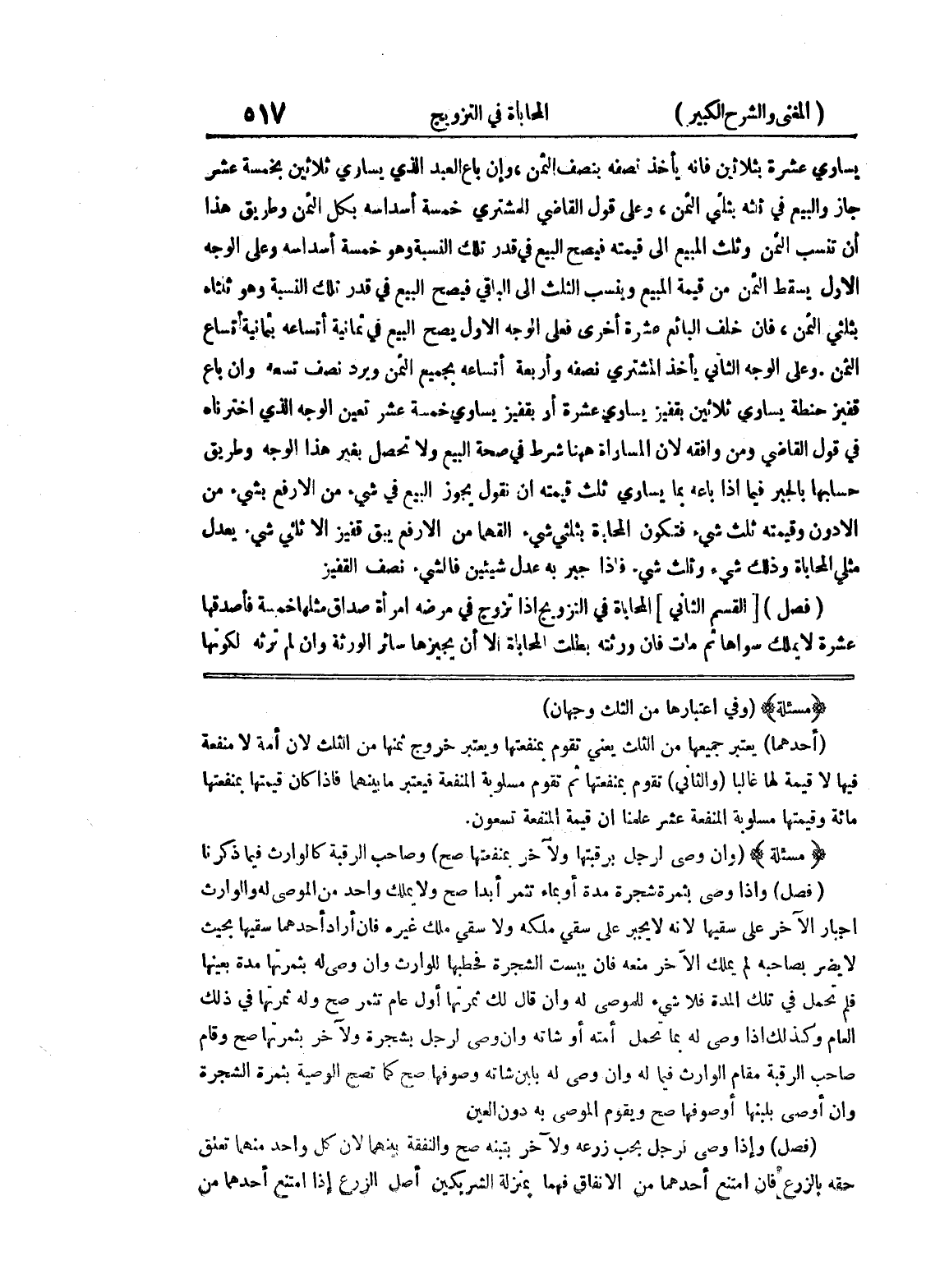 * (مسألة) * (وفي اعتبارها من الثلث وجهان) (أحدهما) يعتبر جميعها من الثلث يعني تقوم بمنفعتها ويعتبر خروج ثمنها من الثلث لأن أمة لا منفعة فيها لا قيمة لها غالباً (والثاني) تقوم بمنفعتها ثم تقوم مسلوبة المنفعة فيعتبر ما بينهما فإذا كان قيمتها بمنفعتها مائة وقيمتها مسلوبة المنفعة عشر علمنا أن قيمة المنفعة تسعون.