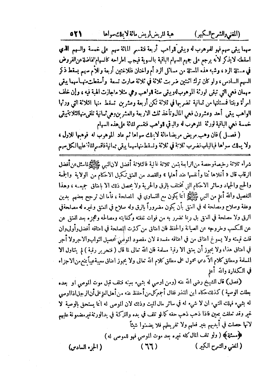 وعفة وصلاح ومصلحة له في العتق بأن يكون مضروراً بالرق وله صلاح في العتق وغيره له مصلحة في الرق ولا مصلحة في العتق بل ربما تضرر به من فوات نفقته وكفايته ومصالحه وعجزه بعد العتق عن عن الكسب وخروجه عن الصيانة والحفظ فإن إعتاق من كثرت المصحلة في إعتاقه أفضل وأولى وإن قلت قيمته ولا يسوغ إعتاق من في إعتاقه مفسدة لأن مقصود الموصي تحصيل الثواب والأجر ولا أجر في إعتاق هذا، ولا يجوز أن يعتق إلا رقبة مسلمة فإن الله تعالى لما قال (فتحرير رقبة) فلم يتناول إلا المسلمة ومطلق كلام الآدمي محمول على مطلق كلام الله تعالى ولا يجوز إعتاق معيبة عيباً يمنع من الاجزاء في الكفارة والله أعلم * (فصل) * قال الشيخ رضي الله عنه (ومن أوصى له بشئ بعينه فتلف قبل موت الموصي أو بعده بطلت الوصية) كذلك حكاه ابن المنذر فقال أجمع كل من أحفظ عنه من أهل العلم على أن الرجل إذا أوصى له بشئ فهلك الشئ ان لا شئ له في سائر مال الميت وذلك لأن الموصى له إنما يستحق بالوصية لا غير وقد تعلقت بمعين فإذا ذهب ذهب حقه كما لو تلف في يده والتركة في يد الورثة غير مضمونة عليهم لأنها حصلت في أيديهم بغير فعلهم ولا تفريطهم فلا يضمنوا شيئاً * (مسألة) * (ولو تلف المال كله غيره بعد موت الموصي فهو للموصي له)