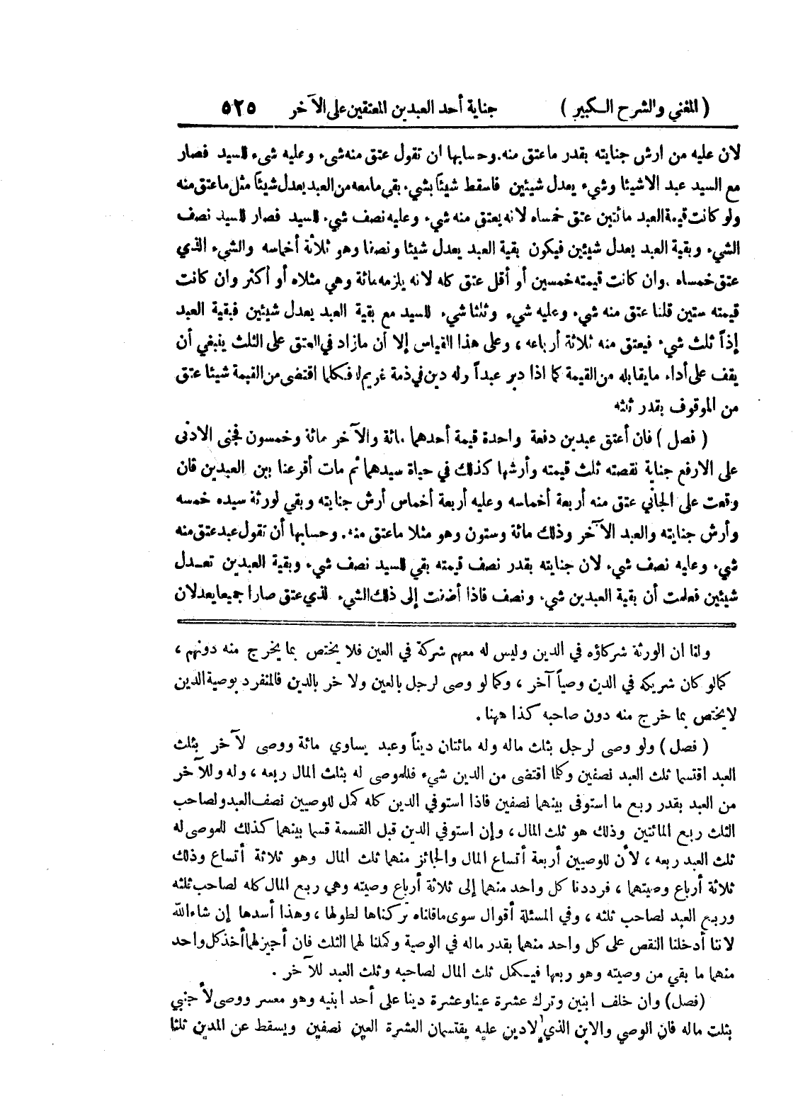 (فصل) ولو وصى لرجل بثلث ماله وله مائتان ديناً وعبد يساوي مائة ووصى لآخر بثلث العبد اقتسما ثلث العبد نصفين وكلما اقتضي من الدين شئ فللموصى له بثلث المال ربعه، وله وللآخر من العبد بقدر ربع ما استوفى بينهما نصفين فإذا استوفي الدين كله كمل للوصيين نصف العبد ولصاحب الثلث ربع المائتين وذلك هو ثلث المال، وإن استوفي الدين قبل القسمة قسما بينهما كذلك للموصى له ثلث العبد ربعه، لأن للوصيين أربعة أتساع المال والجائز منهما ثلث المال وهو ثلاثة أتساع وذلك ثلاثة أرباع وصيتهما، فرددنا كل واحد منهما إلى ثلاثة أرباع وصيته وهي ربع المال كله لصاحب ثلثه وربع العبد لصاحب ثلثه، وفي المسألة أقوال سوى ما قلناه تركناها لطولها، وهذا أسدها إن شاء الله لأننا أدخلنا النقص على كل واحد منهما بقدر ماله في الوصية وكملنا لهما الثلث فإن أجيز لهما أخذ كل واحد منهما ما بقي من وصيته وهو ربعها فيكمل ثلث المال لصاحبه وثلث العبد للآخر.