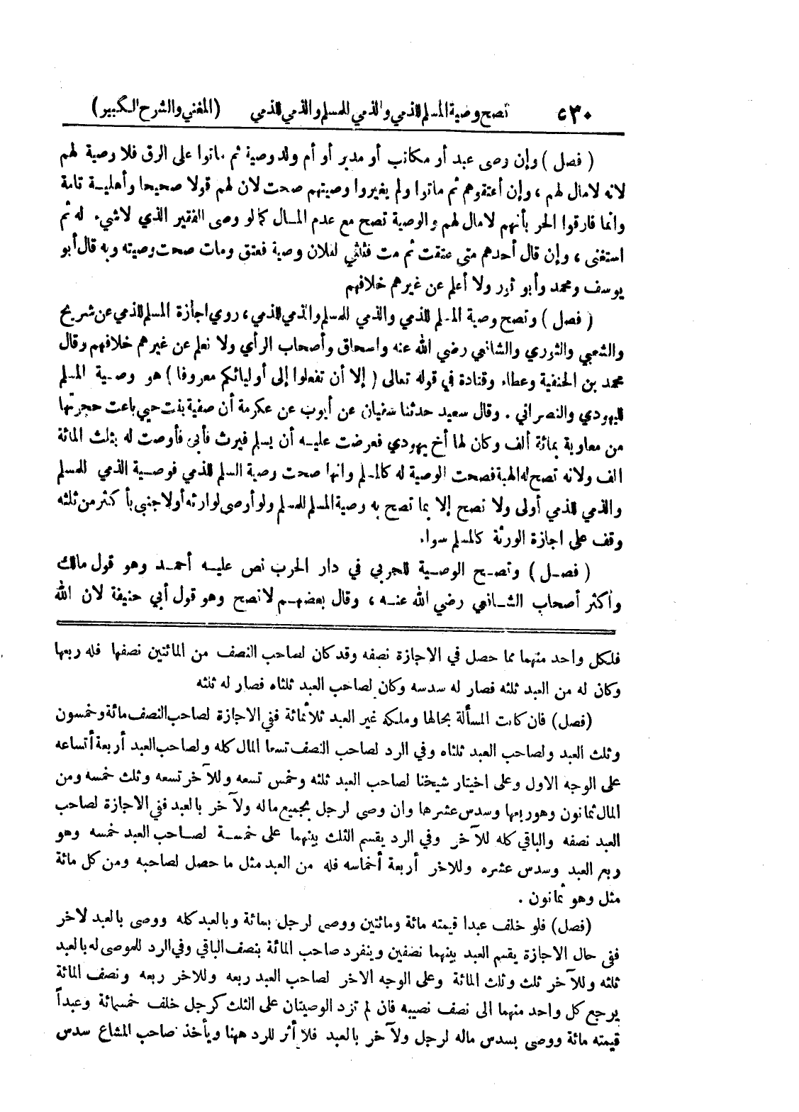 فلكل واحد منهما مما حصل في الإجازة نصفه وقد كان لصاحب النصف من المائتين نصفها فله ربعها وكان له من العبد ثلثه فصار له سدسه وكان لصاحب العبد ثلثاه فصار له ثلثه (فصل) فإن كانت المسألة بحالها وملكه غير العبد ثلاثمائة ففي الاجازة لصاحب النصف مائة وخمسون وثلث العبد ولصاحب العبد ثلثاه وفي الرد لصاحب النصف تسعا المال كله ولصاحب العبد أربعة أتساعه على الوجه الأول وعلى اختيار شيخنا لصاحب العبد ثلثه وخمس تسعه وللآخر تسعه وثلث خمسه ومن المال ثمانون وهو ربعها وسدس عشرها وإن وصى لرجل بجميع ماله ولآخر بالعبد ففي الإجازة لصاحب العبد نصفه والباقي كله للآخر وفي الرد يقسم الثلث بينهما على خمسة لصاحب العبد خمسه وهو ربع العبد وسدس عشره وللآخر أربعة أخماسه فله من العبد مثل ما حصل لصاحبه ومن كل مائة مثل وهو ثمانون.