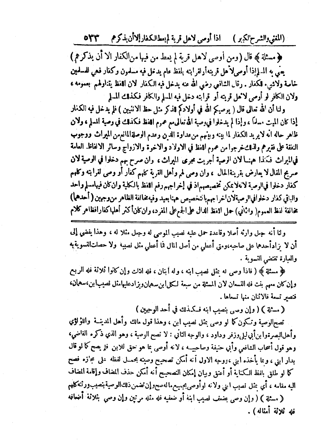 * (مسألة) * (وإن وصى بنصيب ابنه فكذلك في أحد الوجهين) تصح الوصية وتكون كما لو وصى بمثل نصيب ابن، وهذا قول مالك وأهل المدينة واللؤلؤي وأهل البصرة وابن أبي ليلى وزفر وداود، والوجه الثاني: لا تصح الوصية، وهو الذي ذكره القاضي، وهو قول أصحاب الشافعي وأبي حنيفة وصاحبيه، لأنه أوصى بما هو حق للابن فلم يصح كما لو قال بدار ابني، وبما يأخذه ابني، ووجه الأول أنه أمكن تصحيح وصيته بحمل لفظه على مجازه فصح كما لو طلق بلفظ الكناية أو أعتق وبيان إمكان التصحيح أنه أمكن حذف المضاف وإقامة المضاف إليه مقامه، أي بمثل نصيب ابني ولأنه لو أوصى بجميع ماله صح وإن تضمن ذلك الوصية بنصيب ورثته كلهم