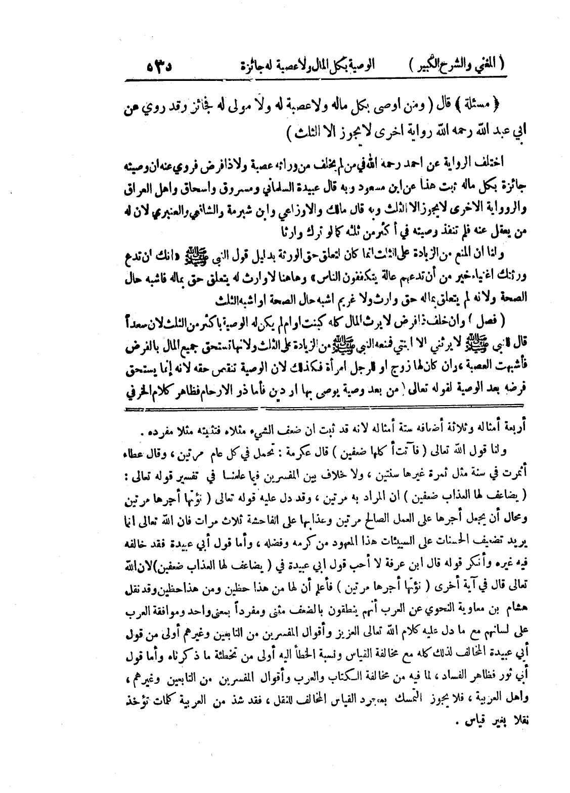 ولنا قول الله (فآتت أكلها ضعفين) قال عكرمة: تحمل في كل عام مرتين، قال عطاء أثمرت في سنة مثل ثمرة غيرها سنتين، ولا خلاف بين المفسرين فيما علمنا في تفسير قوله تعالى: (يضاعف لها العذاب ضعفين) إن المراد به مرتين، وقد دل عليه قوله تعالى (نؤتها أجرها مرتين ومحال أن يجعل أجرها على العمل الصالح مرتين وعذابها على الفاحشة ثلاث مرات فإن الله تعالى إنما يريد تضعيف الحسنات على السيئات هذا المعهود من كره وفضله، وأما قول أبي عبيدة فقد خالفه فيه غيره وأنكر قوله قال ابن عرفة لا أحب قول أبي عبيدة في (يضاعف لها العذاب ضعفين) لأن الله تعالى قال في آية أخرى (نؤتها أجرها مرتين) فأعلم أن لها من هذا حظين ومن هذا حظين وقد نقل هشام بن معاوية النحوي عن العرب أنهم ينطقون بالضعف مثنى ومفرداً بمعنى واحد وموافقة العرب على لسانهم مع ما دل عليه كلام الله تعالى العزيز وأقوال المفسرين من التابعين وغيرهم أولى من قول أبي عبيدة المخالف لذلك كله مع مخالفة القياس ونسبة الخطأ إليه أولى من تخطئه ما ذكرناه وأما قول أبي ثور فظاهر الفساد، لما فيه من مخالفة الكتاب والعرب وأقوال المفسرين من التابعين وغيرهم، وأهل العربية، فلا يجوز التمسك بمجرد القياس المخالف للنقل، فقد شذ من العربية كلمات تؤخذ نقلاً بغير قياس.