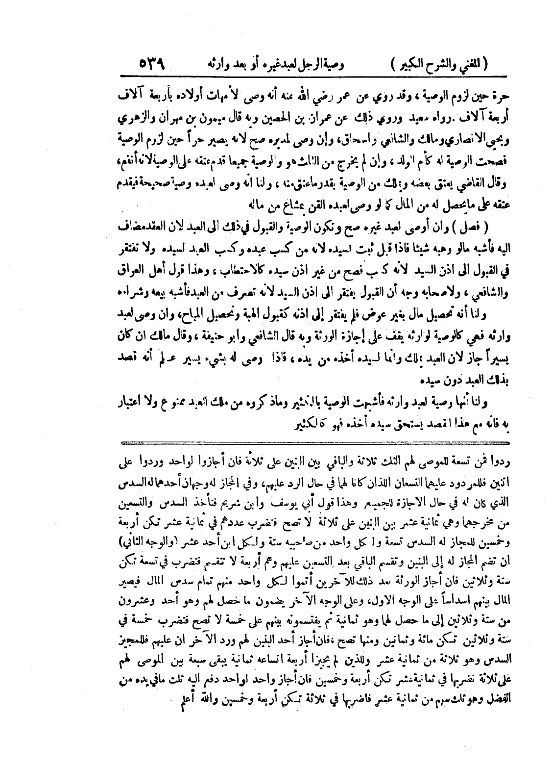 أن تضم المجاز له إلى البنين وتقسم الباقي بعد التسعين عليهم وهم أربعة لا تنقسم فتضرب في تسعة تكن ستة وثلاثين فإن أجاز الورثة بعد ذلك للآخرين أتموا لكل واحد منهم تمام سدس المال فيصير المال بينهم أسداساً على الوجه الأول، وعلى الوجه الآخر يضمون ما حصل لهم وهو أحد وعشرون من ستة وثلاثين إلى ما حصل لهما وهو ثمانية ثم يقتسمونه بينهم على خمسة لا تصح فتضرب خمسة في ستة وثلاثين تكن مائة وثمانين ومنها تصح، فإن أجاز أحد البنين لهم ورد الآخر ان عليهم فللمجيز السدس وهو ثلاثة من ثمانية عشر وللذين لم يجيزا أربعة اتساعه ثمانية يبقى سبعة بين الموصى لهم على ثلاثة نضربها في ثمنانية عشر تكن أربعة وخمسين فإن أجاز واحد لواحد دفع إليه ثلث ما في يده من الفضل وهو ثلث سهم من ثمانية عشر فاضربها في ثلاثة تكن أربعة وخسمين والله أعلم