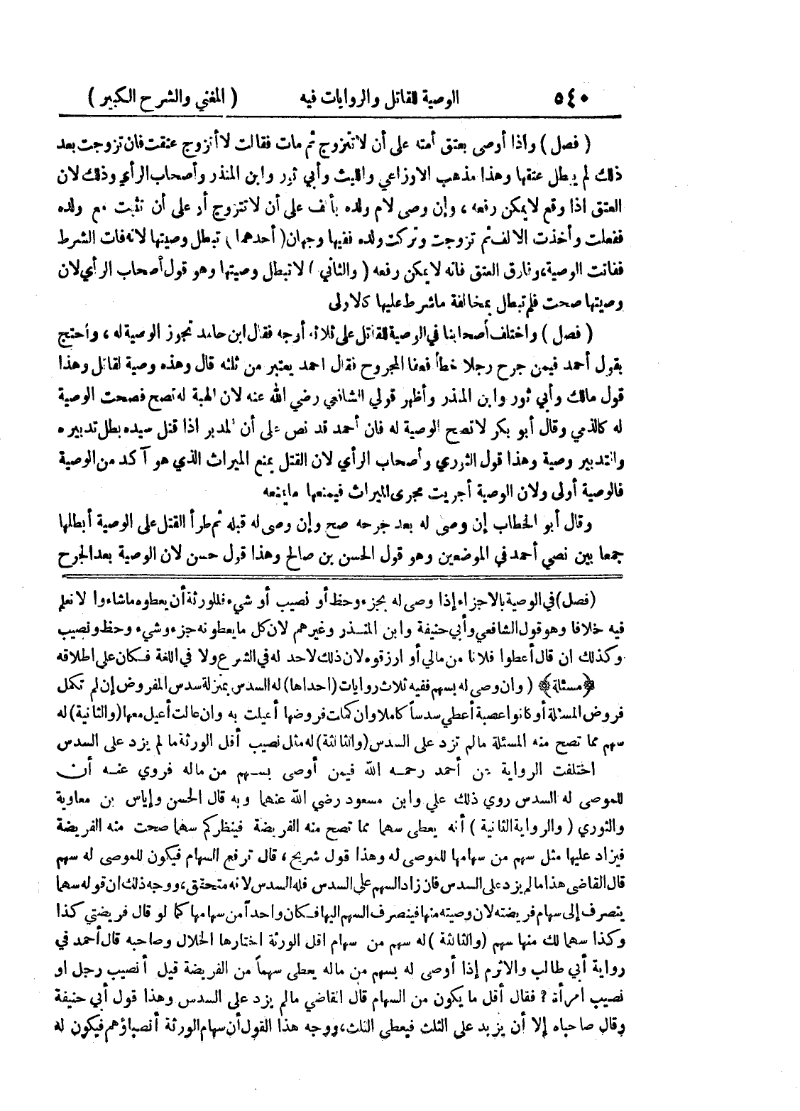 (فصل) في الوصية بالأجزاء إذا وصى له بجزء وحظ أو نصيب أو شئ فللورثة أن يعطوه ما شاءوا لا نعلم فيه خلافاً وهو قول الشافعي وأبي حنيفة وابن المنذر وغيرهم لأن كل ما يعطونه جزء وشئ وحظ ونصيب وكذلك إن قال أعطوا فلاناً من مالي أو ارزقوه لأن ذلك لاحد له في الشرع ولا في اللغة فكان على إطلاقه * (مسألة) * (وإن وصى له بسهم ففيه ثلاث روايات (إحداها) له له السدس بمنزلة سدس المفروض إن لم تكمل فروض المسألة أو كانوا عصبة أعطي سدساً كاملاً وإن كملت فروضها أعيلت به وإن عالت أعيل معها (والثانية) له سهم مما تصح منه المسألة ما لم تزد على السدس (والثالثة) له مثل نصيب أقل الورثة ما لم يزد على السدس اختلفت الرواية عن أحمد رحمه الله فيمن أوصى بسهم من ماله فروي عنه أن للموصى له السدس روى ذلك علي وابن مسعود رضي الله عنهما وبه قال الحسن وأياس بن معاوية والثوري (والرواية الثانية) أنه يعطى سهماً مما تصح منه الفريضة فينظركم سهماً صحت منه الفريضة فيزاد عليها مثل سهم من سهامها للموصى له وهذا قول شريح، قال ترفع السهام فيكون للموصى له سهم قال القاضي هذا ما لم يزد على السدس فإن زاد السهم على السدس فله السدس لأنه متحقق، ووجه ذلك أن قوله سهماً ينصرف إلى سهام فريضته لأن وصيته منها فينصرف السهم إليها فكان واحداً من سهامها كما لو قال فريضتي كذا وكذا سهماً لك منها سهم (والثالثة) له سهم من سهام أقل الورثة اختارها الخلال وصاحبه قال أحمد في