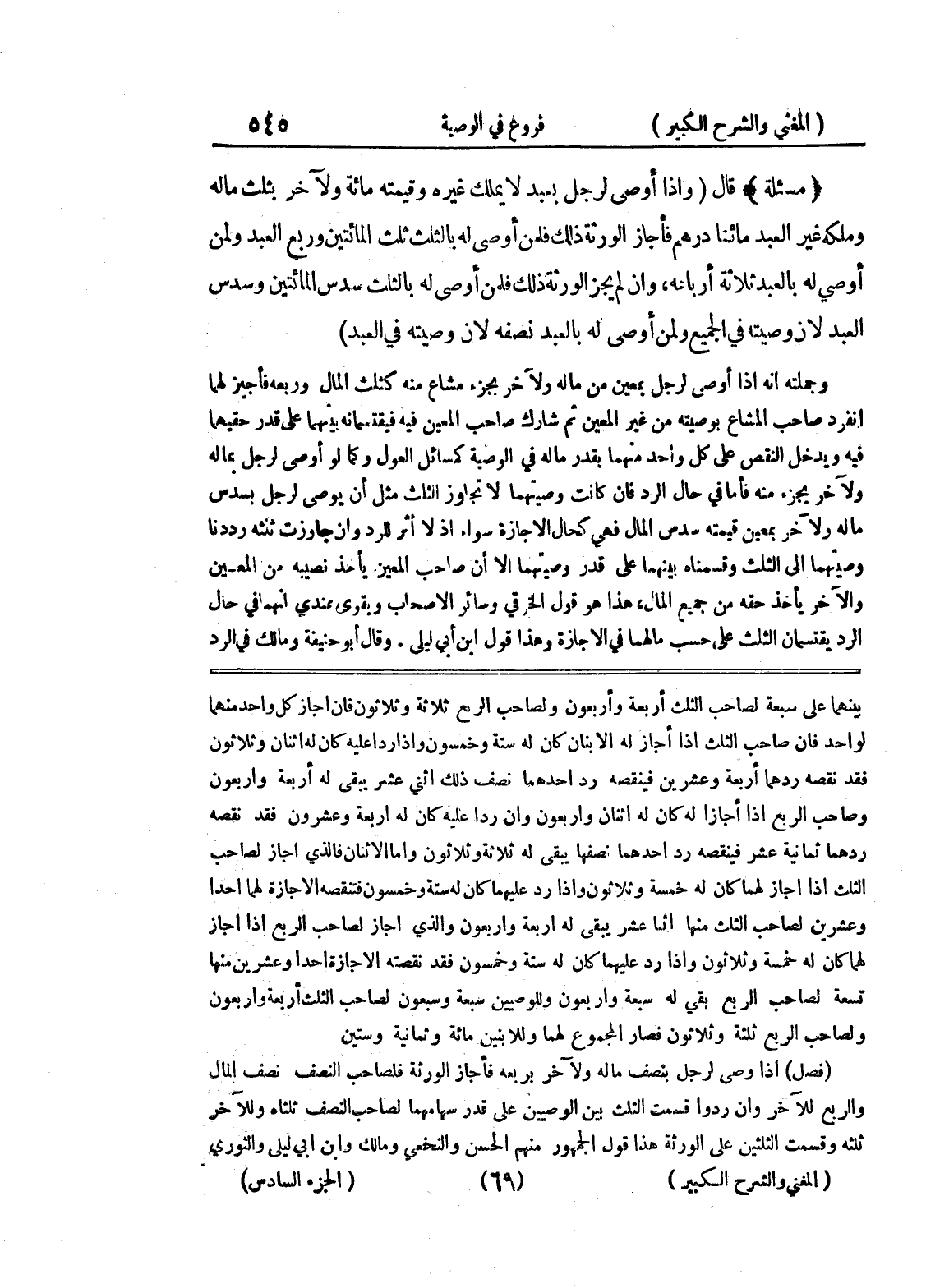 بينهما على سبعة لصاحب الثلث أربعة أربعون ولصاحب الربع ثلاثة وثلاثون فإن أجاز كل واحد منهما لواحد فإن صاحب الثلث إذا أجاز له الابنان كان له ستة وحمسون وإذا ردا عليه كان له اثنان وثلاثون فقد نقصه ردهما أربعة وعشرين فينقصه رد أحدهما نصف ذلك أثني عشر يبقى له أربعة وأربعون وصاحب الربع إذا أجازا له كان له اثنان وأربعون وإن ردا عليه كان له أربعة وعشرون فقد نقصه ردهما ثمانية عشر فينقصه رد أحدهما نصفها يبقى له ثلاثة وثلاثون وأما الاثنان فالذي أجاز لصاحب الثلث إذا أجاز لهما كان له خمسة وثلاثون وإذا رد عليهما كان له ستة وخمسون فتنقصه الإجازة لهما أحداً وعشرين لصاحب الثلث منها اثنا عشر يبقى له أربعة وأربعون والذي أجاز لصاحب الربع إذا أجاز لهما كان له خمسة وثلاثون وإذا رد عليهما كان له ستة وخمسون فقد نقصته الا جازة أحداً وعشرين منها تسعة لصاحب الربع بقي له سبعة وأربعون وللوصيين سبعة وسبعون لصاحب الثلث أربعة وأربعون ولصاحب الربع ثلثة وثلاثون فصار المجموع لهما وللابنين مائة وثمانية وستين (فصل) إذا وصى لرجل بنصف ماله ولآخر بربعه فأجاز الورثة فلصاحب النصف نصف المال والربع للآخر وإن ردوا قسمت الثلث بين الوصيين على قدر سهامهما لصاحب النصف ثلثاه وللآخر ثلثه وقسمت الثلثين على الورثة هذا قول الجمهور منهم الحسن والنخعي ومالك وابن أبي ليلى والثوري