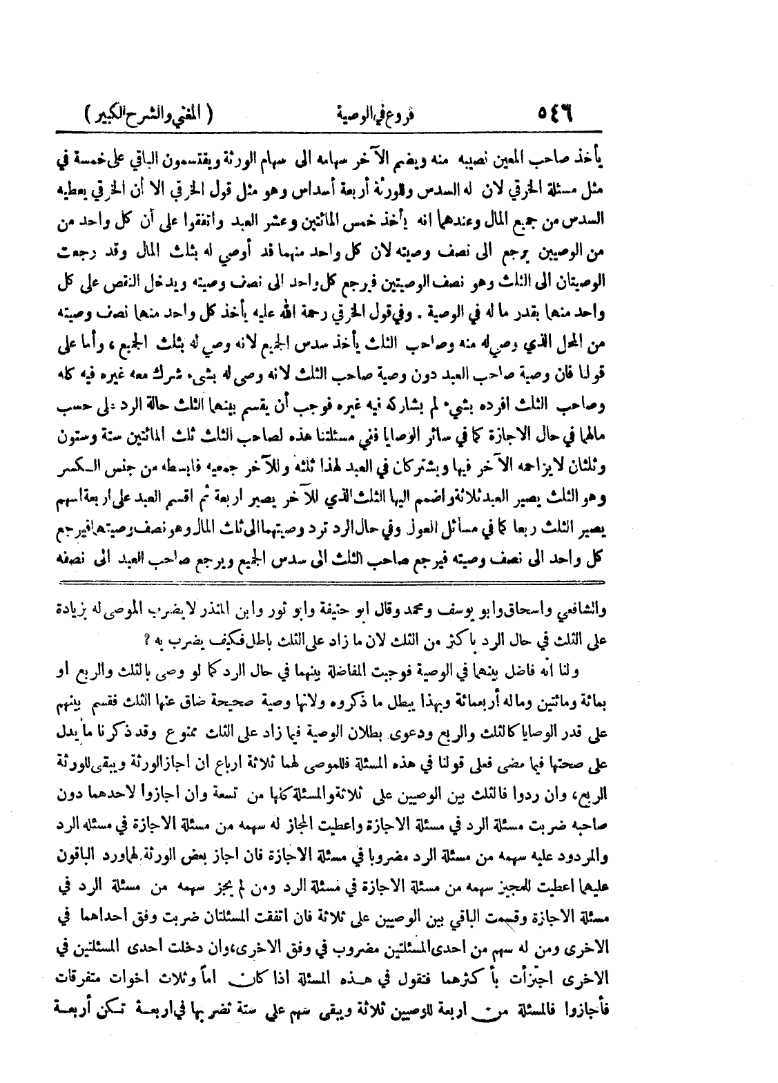 والشافعي واسحاق وأبو يوسف ومحمد وقال أبو حنيفة وأبو ثور وابن المنذر لا يضرب الموصى له بزيادة على الثلث في حال الرد بأكثر من الثلث لأن ما زاد على الثلث باطل فكيف يضرب به؟ ولنا أنه فاضل بينهما في الوصية فوجبت المفاضلة بينهما في حال الرد كما لو وصى بالثلث والربع أو بمائة ومائتين وماله أربعمائة وبهذا يبطل ما ذكروه ولأنها وصية صحيحة ضاق عنها الثلث فقسم بينهم على قدر الوصايا كالثلث والربع ودعوى بطلان الوصية فيما زاد على الثلث ممنوع وقد ذكرنا ما يدل على صحتها فيما مضى فعلى قولنا في هذه المسألة فللموصى لهما ثلاثة أرباع إن أجاز الورثة ويبقى للورثة الربع، وإن ردوا فالثلث بين الوصيين على ثلاثة والمسألة كلها من تسعة وإن أجازوا لأحدهما دون