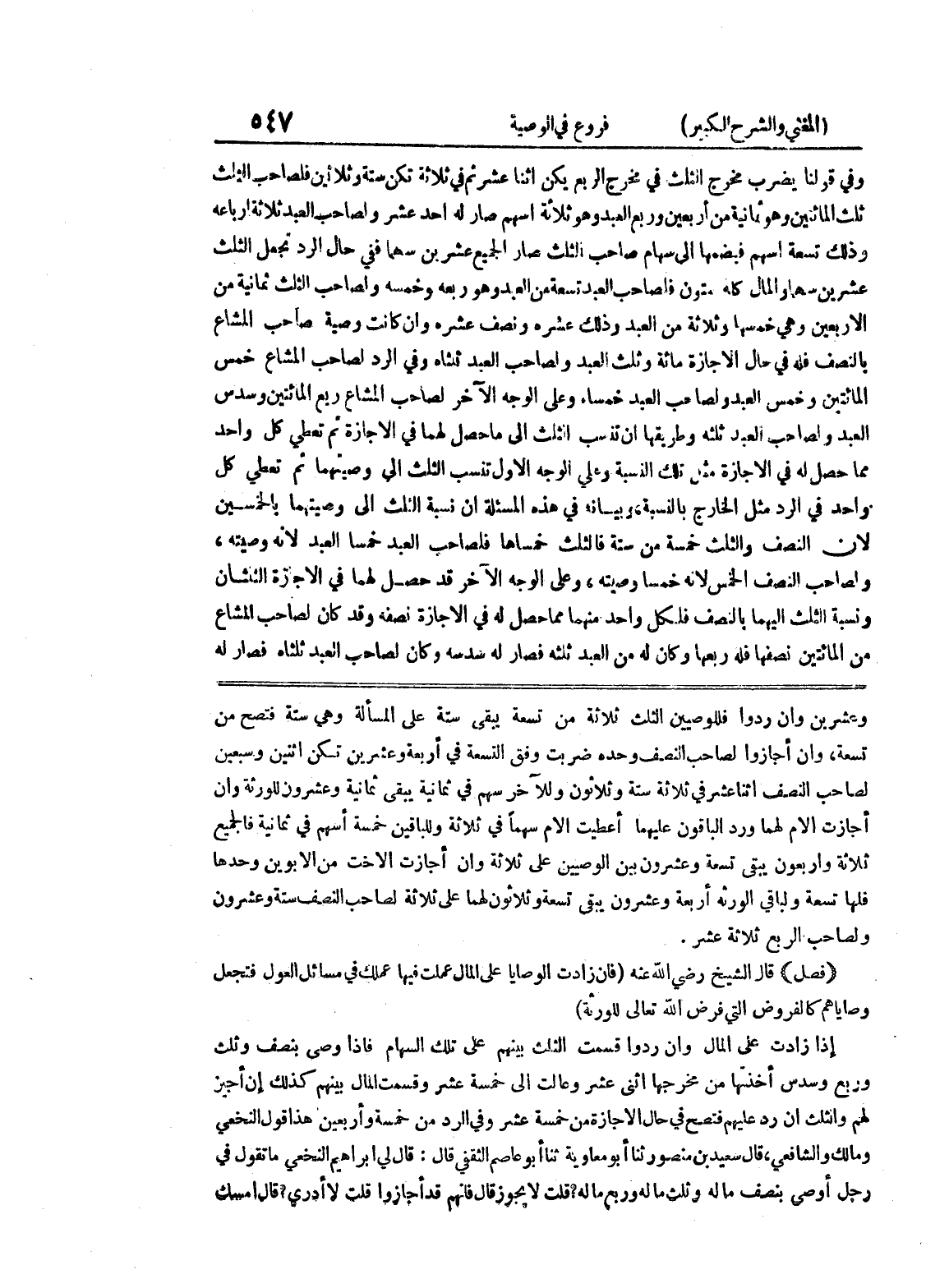 وعشرين وإن ردوا فللوصيين الثلث ثلاثة من تسعة يبقى ستة على المسألة وهي ستة فتصح من تسعة، وإن أجازوا لصاحب النصف وحده ضربت وفق التسعة في أربعة وعشرين تكن اثنين وسبعين لصاحب النصف اثنا عشر في ثلاثة ستة وثلاثون وللآخر سهم في ثمانية يبقى ثمانية وعشرون للورثة وإن أجازت الأم لهما ورد الباقون عليهما أعطيت الأم سهماً في ثلاثة وللباقين خمسة أسهم في ثمانية فالجميع ثلاثة وأربعون يبقى تسعة وعشرون بين الوصيين على ثلاثة وإن أجازت الأخت من الأبوين وحدها فلها تسعة ولباقي الورثة أربعة وعشرون يبقى تسعة وثلاثون لهما على ثلاثة لصاحب النصف ستة وعشرون ولصاحب الربع ثلاثة عشر * (فصل) * قال الشيخ رضي الله عنه (فإن زادت الوصايا على المال عملت فيها عملك في مسائل العول فتجعل وصاياهم كالفروض التي فرض الله تعالى للورثة) إذا زادت على المال وإن ردوا قسمت الثلث بينهم على تلك السهام فإذا وصى بنصف وثلث وربع وسدس أخذتها من مخرجها اثني عشر وعالت إلى خمسة عشر وقسمت المال بينهم كذلك إن أجيز لهم والثلث إن رد عليهم فتصح في حال الإجازة من خمسة عشر وفي الرد من خمسة وأربعين هذا قول النخعي ومالك والشافعي، قال سعيد بن منصور ثنا أبو معاوية ثنا أبو عاصم الثقفي قال: قال لي إبراهيم النخعي ما تقول في رجل أوصى بنصف ماله وثلث ماله وربع ماله؟ قلت لا يجوز قال فإنهم قد أجازوا قلت لاأدري؟ قال امسك