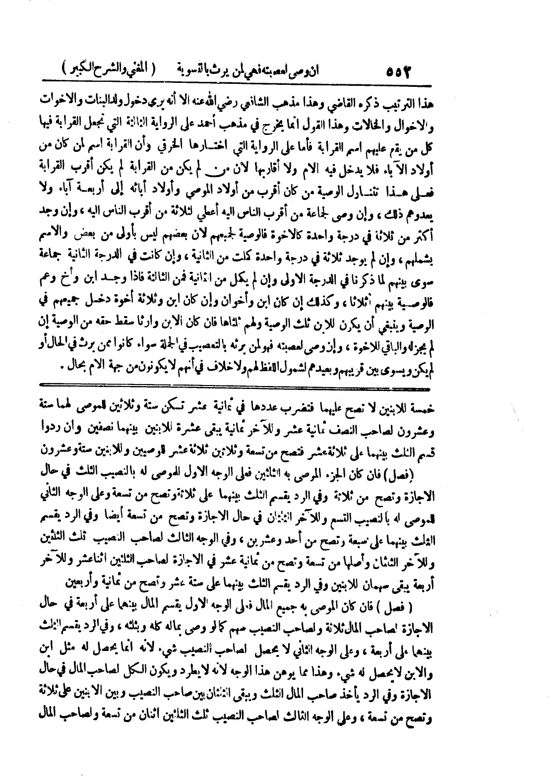 الثلث بينهما على سبعة وتصح من أحد وعشرين، وفي الوجه الثالث لصاحب النصيب ثلث الثلثين وللآخر الثلثان وأصلها من تسعة وتصح من ثمانية عشر في الإجازة لصاحب الثلثين اثنا عشر وللآخر أربعة يبقى سهمان للابنين وفي الرد يقسم الثلث بينهما على ستة عشر وتصح من ثمانية وأربعين (فصل) فإن كان الموصى به جميع المال فعلى الوجه الأول يقسم المال بينهما على أربعة في حال الاجازة لصصاحب المال ثلاثة ولصاحب النصيب سهم كما لو وصى بماله كله وبثلثه، وفي الرد يقسم الثلث بينهما على أربعة، وعلى الوجه الثاني لا يحصل لصاحب النصيب شئ لأنه إنما يحصل له مثل ابن والابن لا يحصل له شئ وهذا ما يوهن هذا الوجه لأنه لا يطرد ويكون الكل لصاحب المال في حال الإجازة وفي الرد يأخذ صاحب المال الثلث ويبقى الثلثان بين صاحب النصيب وبين الابنين على ثلاثة وتصح من تسعة، وعلى الوجه الثالث لصاحب النصيب ثلث الثلثين اثنان من تسعة ولصاحب المال