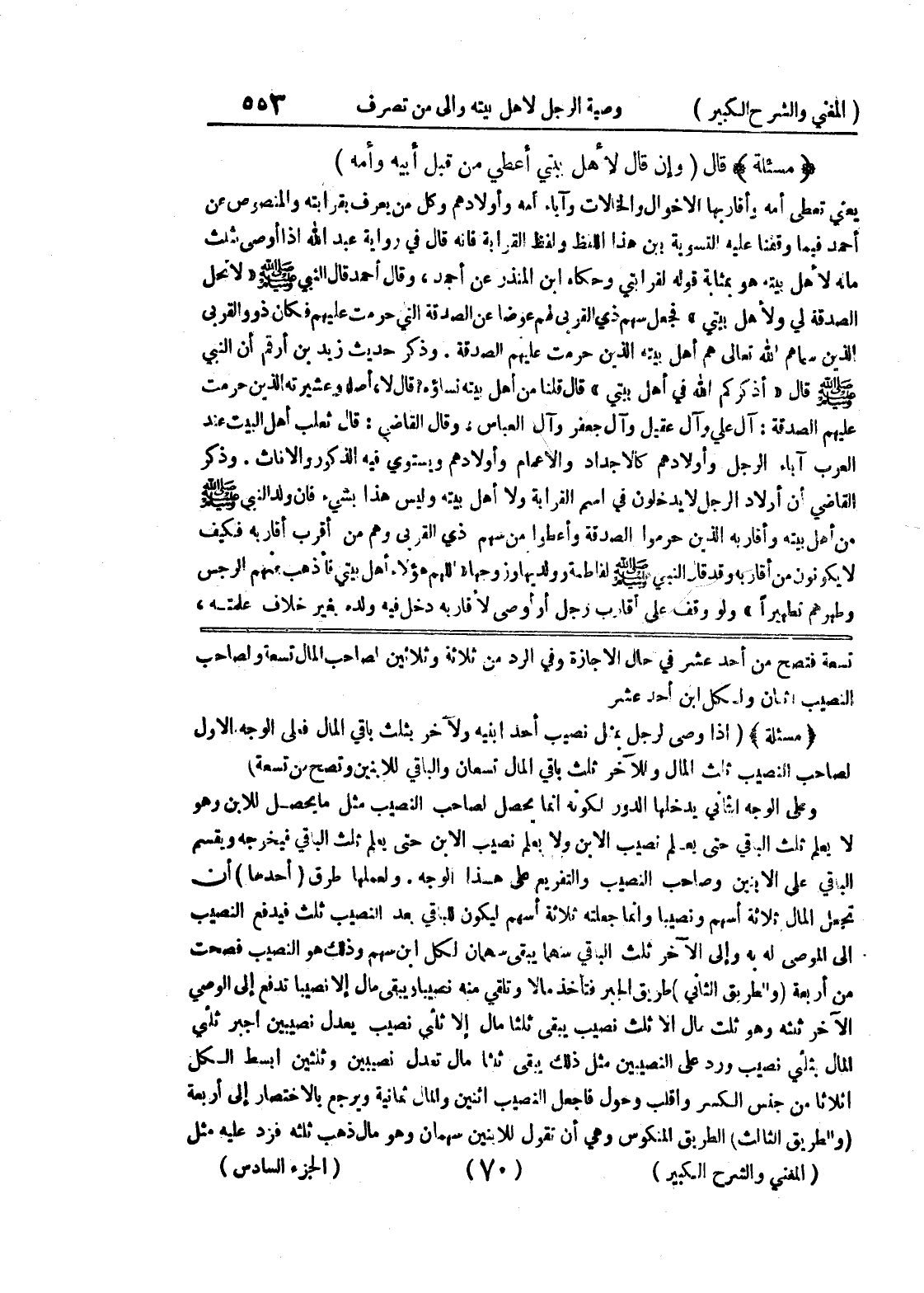 ولعملها طرق (أحدها) أن تجعل المال ثلاثة أسهم ونصيباً وإنما جعلته ثلاثة أسهم ليكون للباقي بعد النصيب ثلث فيدفع النصيب إلى الموصى له به وإلى الآخر ثلث الباقي سهما يبقى سهمان لكل ابن سهم وذلك هو النصيب فصحت من أربعة (والطريق الثاني) طريق الجبر فتأخذ مالاً وتلقي منه نصيباً ويبقى مال إلا نصيباً تدفع إلى الوصي الآخر ثلثه وهو ثلث مال إلا ثلث نصيب يبقى ثلثا مال إلا ثلثي نصيب يعدل نصيبين أجبر ثلثي المال بثلثي نصيب ورد على النصيبين مثل ذلك يبقى ثلثا مال تعدل نصيبين وثلثين أبسط الكل
