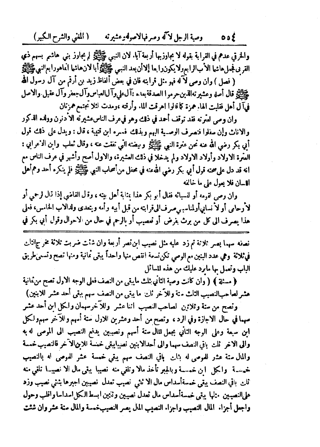 نصفه سهماً يصر ثلاثة ثم زد عليه مثل نصيب ابن تصر أربعة وإن شئت ضربت ثلاثة مخرج الثلث في ثلاثة وهي عدد البنين مع الوصي تكن تسعة أنقص منها واحداً يبقى ثمانية تصح ومنها تصح وتسمى طريق الباب وتعمل بها ما يرد عليك من هذه المسائل * (مسألة) * (وإن كانت وصية الثاني بثلث ما يبقى من النصف فعلى الوجه الأول تصح من ثمانية عشر لصاحب النصيب الثلث ستة وللآخر ثلث ما يبقى من النصف سهم يبقى أحد عشر للابنين) وتصح من ستة وثلاثين لصاحب النصيب اثنا عشر وللآخر سهمان ولكل ابن أحد عشر سهماً في حال الإجازة وفي الرد، وتصح من أحد وعشرين للأول ستة أسهم وللآخر سهم ولكل ابن سبعة وعلى الوجه الثاني يجعل المال ستة أسهم ونصيبين يدفع النصيب إلى الموصى له به وإلى الآخر ثلث باقي النصف سهماً وإلى أحد الابنين نصيباً يبقى خمسة للابن الآخر فالنصيب خمسة والمال ستة عشر للموصى له بثلث باقي النصف سهم يبقى خمسة عشر للموصى له بالنصيب خمسة ولكل ابن خمسة وبالجبر تأخذ مالاً وتلقي منه نصيباً يبقى مال إلا نصيباً تلقي منه ثلث باقي النصف يبقى خمسة أسداس مال إلا ثلثي نصيب تعدل نصيبين أجبرها بثلثي نصيب وزد على النصيين مثلها يبقى خمسة أسداس مال تعدل نصيبين وثلثين أبسط الكل أسداساً واقلب وحول واجعل أجزاء المال النصيب وأجزاء النصيب المال يصر النصيب خمسة والمال ستة عشر وإن شئت