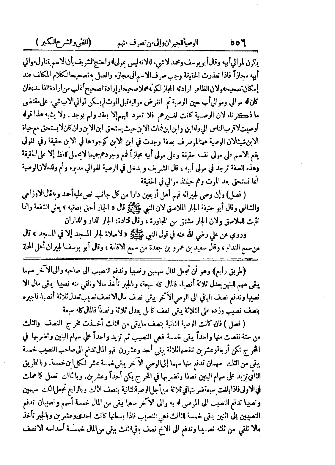 * (طريق رابع) وهو أن تجعل المال سهمين ونصيباً وتدفع النصيب إلى صاحبه وإلى الآخر سهماً يبقى سهم للبنين يعدل ثلاثة أنصباء فالمال كله سبعة، وبالجبر تأخذ مالاً وتلقي منه نصيباً يبقى مال إلا نصيباً وتدفع نصف الباقي إلى الوصي الآخر يبقى نصف مال الانصف نصيب تعدل ثلاثة أنصباء فأجبره بنصف نصيب وزده على الثلاثة يبقى نصف كامل يعدل ثلاثة ونصفاً فالمال كله سبعة (فصل) فإن كانت الوصية الثانية بنصف ما يبقى من الثلث أخذت مخرج النصف والثلث من ستة نقصت منها واحداً يبقى خمسة فهي النصيب ثم تزيد واحداً على سهام البنين وتضربها في المخرج تكن أربعة وعشرين تنقصها ثلاثة يبقى أحد وعشرون فهو المال تدفع إلى صاحب النصيب خمسة يبقى من الثلث سهمان تدفع منها سهماً إلى الوصي الآخر يبقى خمسة عشر لكل ابن خمسة وبالطريق الثاني تزيد على سهام البنين نصفا وتضربها في المخرج يكن أحداً وعشرين.