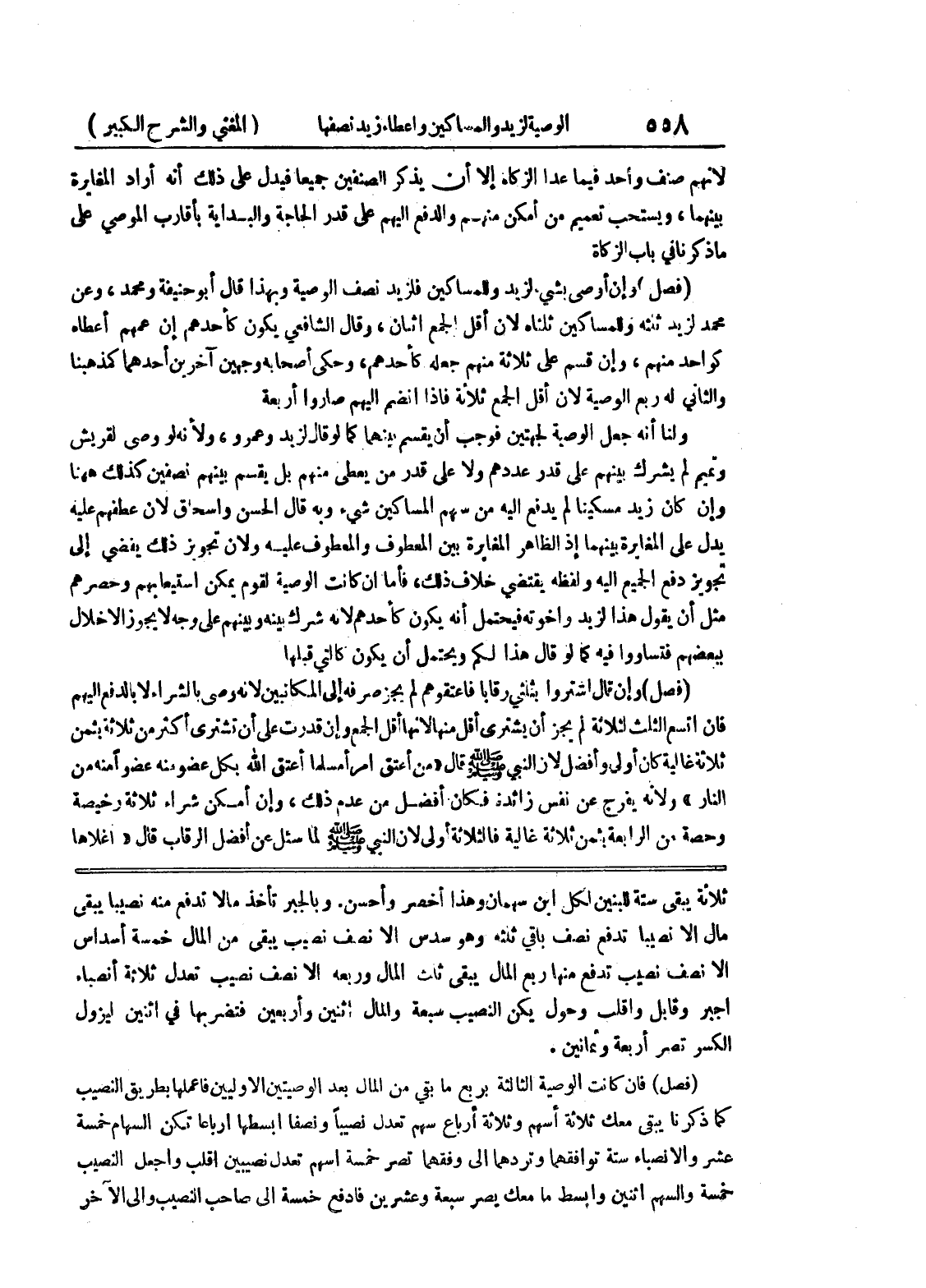 (فصل) فإن كانت الوصية الثالثة بربع ما بقي من المال بعد الوصيتين الأوليين فاعملها بطريق النصيب كما ذكرنا يبقى معك ثلاثة أسهم وثلاثة أرباع سهم تعدل نصيباً ونصفاً ابسطها أرباعاً تكن السهام خمسة عشر والأنصباء ستة توافقهما وتردهما إلى وفقهما تصر خمسة أسهم تعدل نصيبين اقلب واجعل النصيب خمسة والسهم اثنين وابسط ما معك يصر سبعة وعشرين فادفع خمسة إلى صاحب النصيب وإلى الآخر