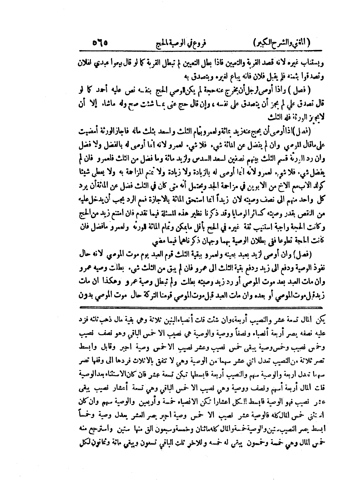 يكن المال تسعة عشر والنصيب أربعة، وإن شئت قلت أنصباء البنين ثلاثة وهي بقية مال ذهب ثلثه فزد عليه نصفه يصر أربعة أنصباء ونصفاً ووصية والوصية هي نصيب إلا خمس الباقي وهو نصف نصيب وخمس نصيب وخمس وصيته يبقى خمس نصيب وعشر نصيب إلا خمس وصية أجبر وقابل وأبسط تصر ثلاثة من النصيب تعدل اثني عشر سهما من الوصية وهي لا تنفق بالأثلاث فردها إلى وقفها تصر سهماً تعدل أربعة والوصية سهم والنصيب أربعة فابسطها تكن تسعة عشر فإن كان الاستثناء بعد الوصية قلت المال أربعة أسهم ونصف ووصية وهي نصيب إلا خمس الباقي وهي تسعة أعشار نصيب يبقى عشر نصيب فهو الوصية فابسط الكل أعشاراً تكن الأنصباء خمسة وأربعين والوصية سهم وإن كان استثنى خمس المال كله فالوصية عشر نصيب إلا خمس وصية أجبر يصر العشر يعدل وصية وخمساً أبسط يصر النصيب ستين والوصية خمسة والمال كله مائتان وخمسة وسبعون ألق منها ستين واسترجع منه خمس المال وهي خمسة وخمسون يبقى له خمسة وللآخر ثلث الباقي تسعون ويبقى مائة وثمانون لكل