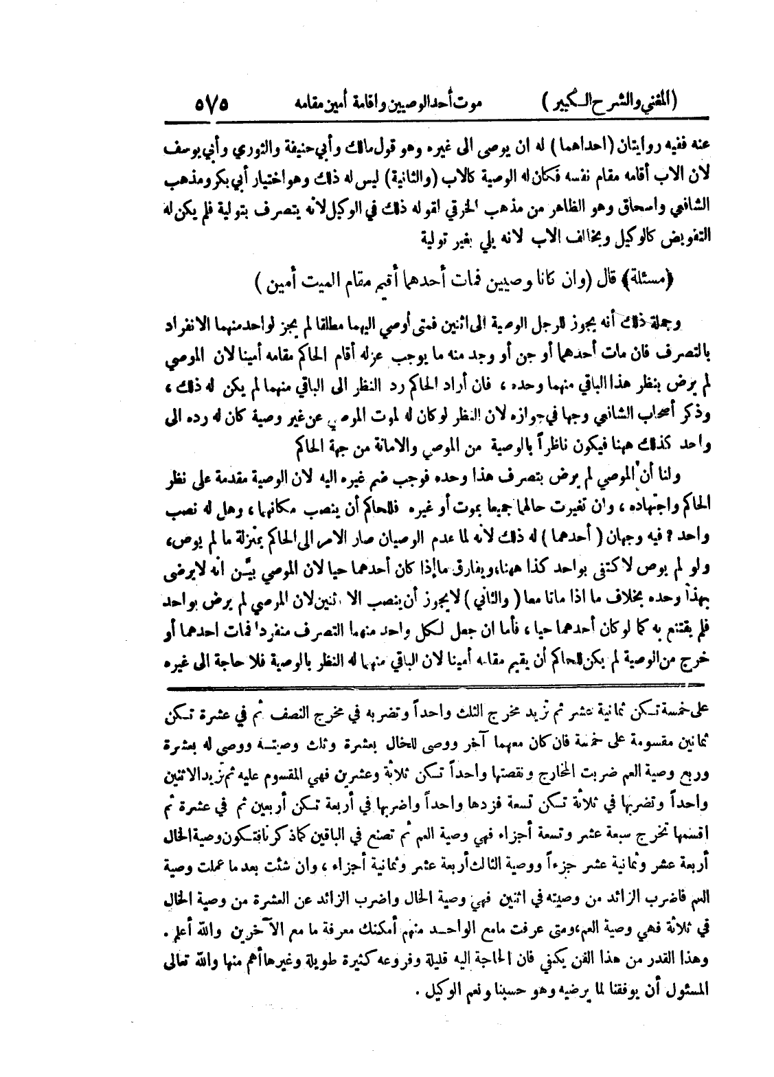 ثمانين مقسومة على خمسة فإن كان معهما آخر ووصى للخال بعشرة وثلث وصيته ووصى له بعشرة وربع وصية العم ضربت المخارج ونقصتها واحداً تكن ثلاثة وعشرين فهي المقسوم عليه ثم تزيد الاثنين واحداً وتضربها في ثلاثة تكن تسعة فزدها واحداً واضربها في أربعة تكن أربعين ثم في عشرة ثم اقسمها تخرج سبعة عشر وتسعة أجزاء فهي وصية العم ثم تصنع في الباقين كما ذكرنا فتكون وصية الخال أربعة عشر وثمانية عشر جزءاً وصية الثالث أربعة عشر وثمانية أجزاء، وإن شئت بعد ما عملت وصية العم فاضرب الزائد من وصيته في اثنين فهي وصية الخال واضرب الزائد عن العشرة من وصية الخال في ثلاثة فهي وصية العم، ومتى عرفت ما مع الواحد منهم أمكنك معرفة ما مع الآخرين والله أعلم.