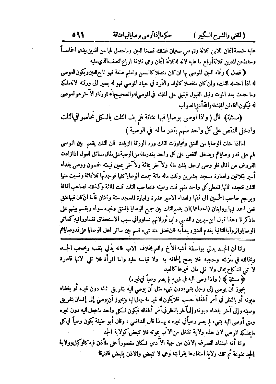 * (مسألة) * (وإذا وصى إليه في شئ لم يصر وصياً في غيره) يجوز أن يوصي إلى رجل بشئ دون شئ مثل أن يوصي إليه بتفريق ثلثه دون غيره أو بقضاء ديونه أو بالنظر في امر أطفاله حسب فلا يكون له غير ما جعل إليه ويجوز أن يوصي إلى إنسان بتفريق وصيته وإلى آخر بقضاء ديونه وإلى آخر بالنظر في امر أطفاله فيكون لكل واحد ما جعل إليه دون غيره ومتى أوصى إليه بشئ لم يصر وصياً في غيره، بهذا قال الشافعي، وقال أبو حنيفة يكون وصياً في كل ما يملكه الموصي لأن هذه ولاية تنتقل من الأب بموته فلا تتبعض كولاية الجد ولنا أنه استفاد التصرف بالاذن من جهة الآدمي فكان مقصوراً على ما أذن فيه كالوكيل وولاية الجد ممنوعة ثم تلك ولاية استفادها بقرابته وهي لا تتبعض والاذن يتبعض فافترقا