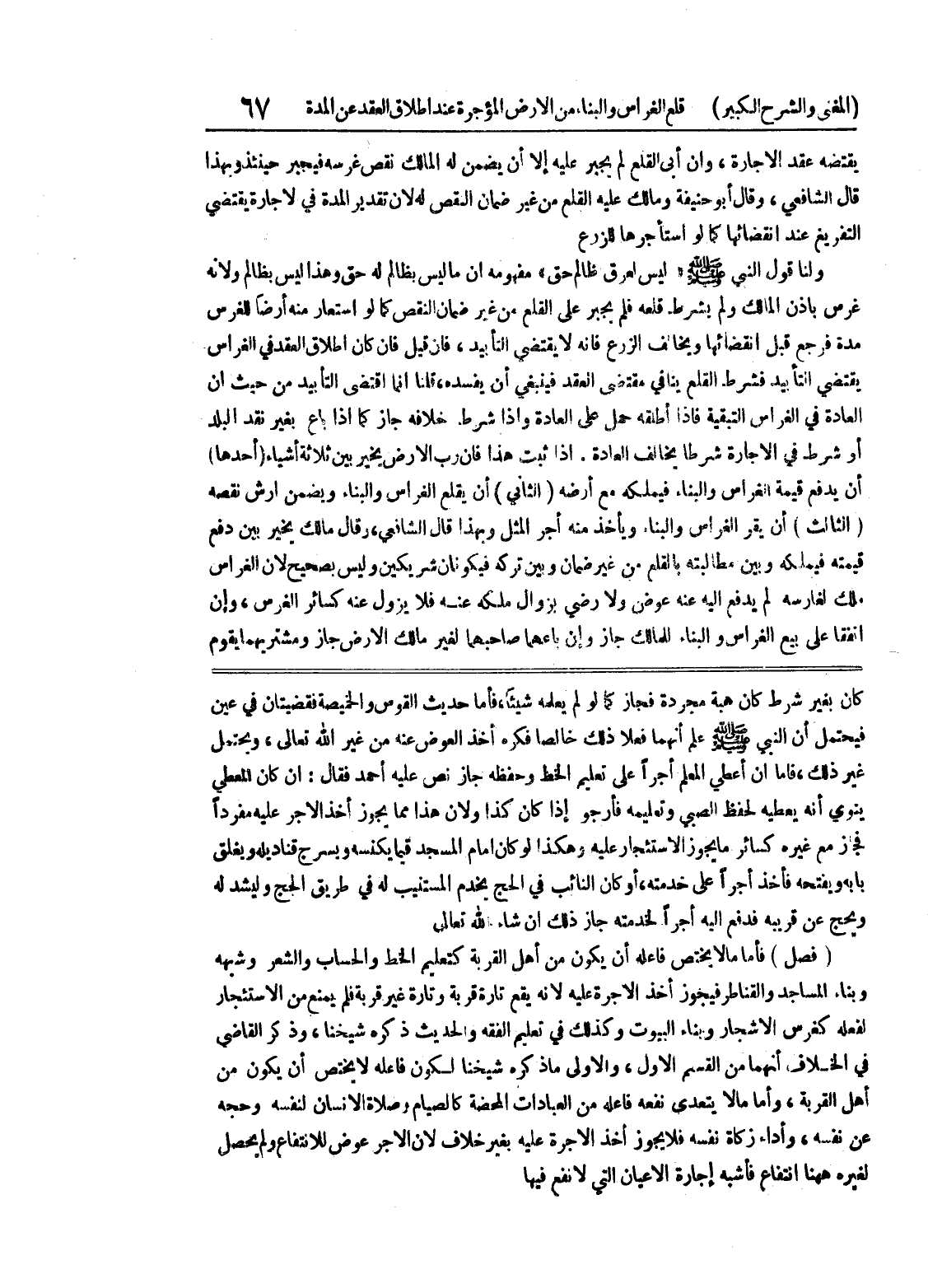 كان بغير شرط كان هبة مجردة فجاز كما لو لم يعلمه شيئاً، فأما حديث القوس والخميصة فقضيتان في عين فيحتمل أن النبي صلى الله عليه وسلم علم أنهما فعلا ذلك خالصا فكره أخذ العوض عنه من غير الله تعالى، ويحتمل غير ذلك، فأما ان أعطى المعلم أجراً على تعليم الخط وحفظه جاز نص عليه أحمد فقال: إن كان المعطي ينوي أنه يعطيه لحفظ الصبي وتعليمه فأرجو إذا كان كذا ولأن هذا مما يجوز أخذ الأجر عليه مفرداً فجاز مع غيره كسائر ما يجوز الاستئجار عليه وهكذا لو كان إمام المسجد قيما يكنسه ويسرج قناديله ويغلق بابه ويفتحه فأخذ أجراً على خدمته، أو كان النائب في الحج يخدم المستنيب له في طريق الحج وليشد له ويحج عن قريبه فدفع إليه أجراً لخدمته جاز ذلك انشاء الله تعالى (فصل) فأما ما لا يختص فاعله أن يكون من أهل القربة كتعليم الخط والحساب والشعر وشبهه وبناء المساجد والقناطر فيجوز أخذ الأجرة عليه لأنه يقع تارة قربة وتارة غير قربة فلم يمنع من الاستئجار لفعله كغرس الأشجار وبناء البيوت وكذلك في تعليم الفقه والحديث ذكره شيخنا، وذكر القاضي في الخلاف أنهما من القسم الأول، والأولى ما ذكره شيخنا لكون فاعله لا يختص أن يكون من أهل القربة، وأما ما لا يتعدى نفعه فاعله من العبادات المحضة كالصيام وصلاة الإنسان لنفسه وحجه عن نفسه، وأداء زكاة نفسه فلا يجوز أخذ الأجرة عليه بغير خلاف لأن الأجر عوض للانتفاع ولم يحصل لغيره ههنا انتفاع فأشبه إجارة الأعيان التي لا نفع فيها