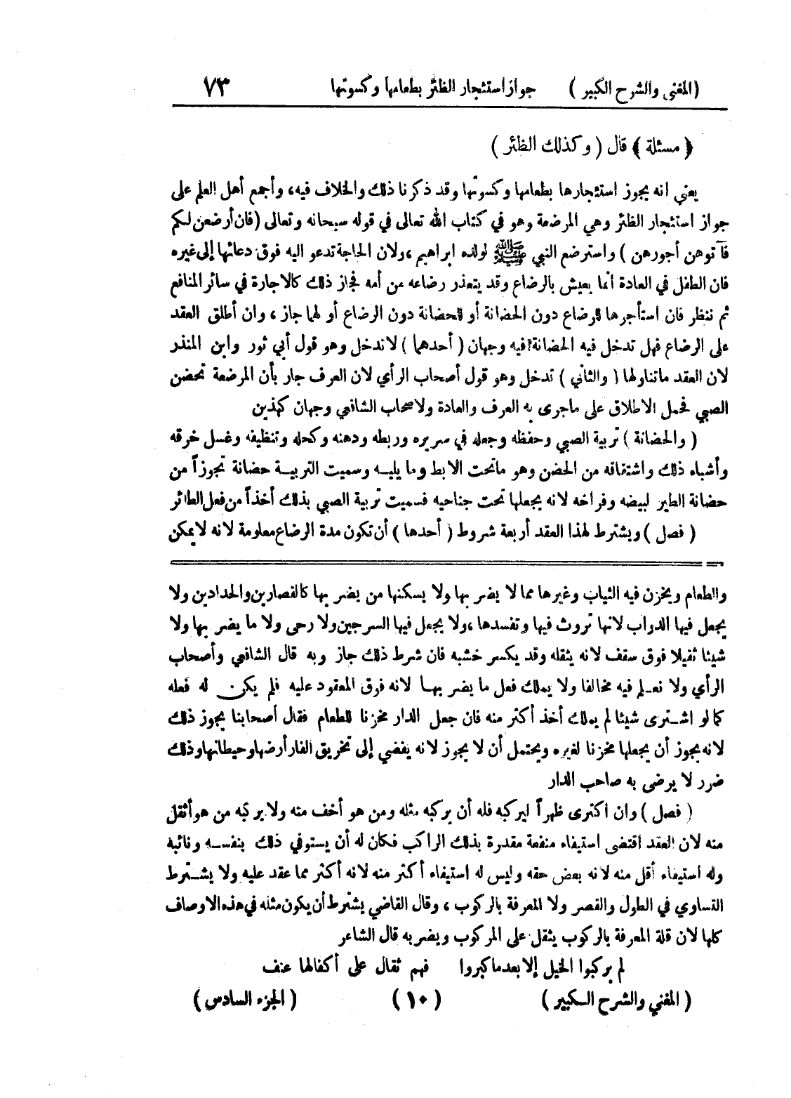 والطعام ويخزن فيه الثياب وغيرها مما لا يضر بها ولا يسكنها من يضر بها كالقصارين والحدادين ولا يجعل فيها الدواب لأنها تروث فيها وتفسدها، ولا يجعل فيها السرجين ولا رحى ولا ما يضر بها ولا شيئا ثقيلا فوق سقف لأنه يثقله وقد يكسر خشبه فإن شرط ذلك جاز وبه قال الشافعي وأصحاب الرأي ولا نعلم فيه مخالفاً ولا يملك فعل ما يضر بها لأنه فوق المعقود عليه فلم يكن له فعله كما لو اشترى شيئا لم يملك أخذ أكثر منه فان جعل الدار مخزنا للطعام فقال أصحابنا يجوز ذلك لأنه يجوز أن يجعلها مخزنا لغيره ويحتمل أن لا يجوز لأنه يفضي إلى تخريق الفأر أرضها وحيطانها وذلك ضرر لا يرضى به صاحب الدار (فصل) وإن اكترى ظهرا ليركبه فله أن يركبه مثله ومن هو أخف منه ولا يركبه من هو أثقل منه لأن العقد اقتضى استيفاء منفعة مقدرة بذلك الراكب فكان له أن يستوفي ذلك بنفسه ونائبه وله استيفاء أقل منه لأنه بعض حقه وليس له استيفاء أكثر منه لأنه أكثر مما عقد عليه ولا يشترط التساوي في الطول والقصر ولا المعرفة بالركوب، وقال القاضي يشترط أن يكون مثله في هذه الأوصاف كلها لأن قلة المعرفة بالركوب يثقل على المركوب ويضر به قال الشاعر لم يركبوا الخيل إلا بعدما كبروا * فهم ثقال على أكفالها عنف