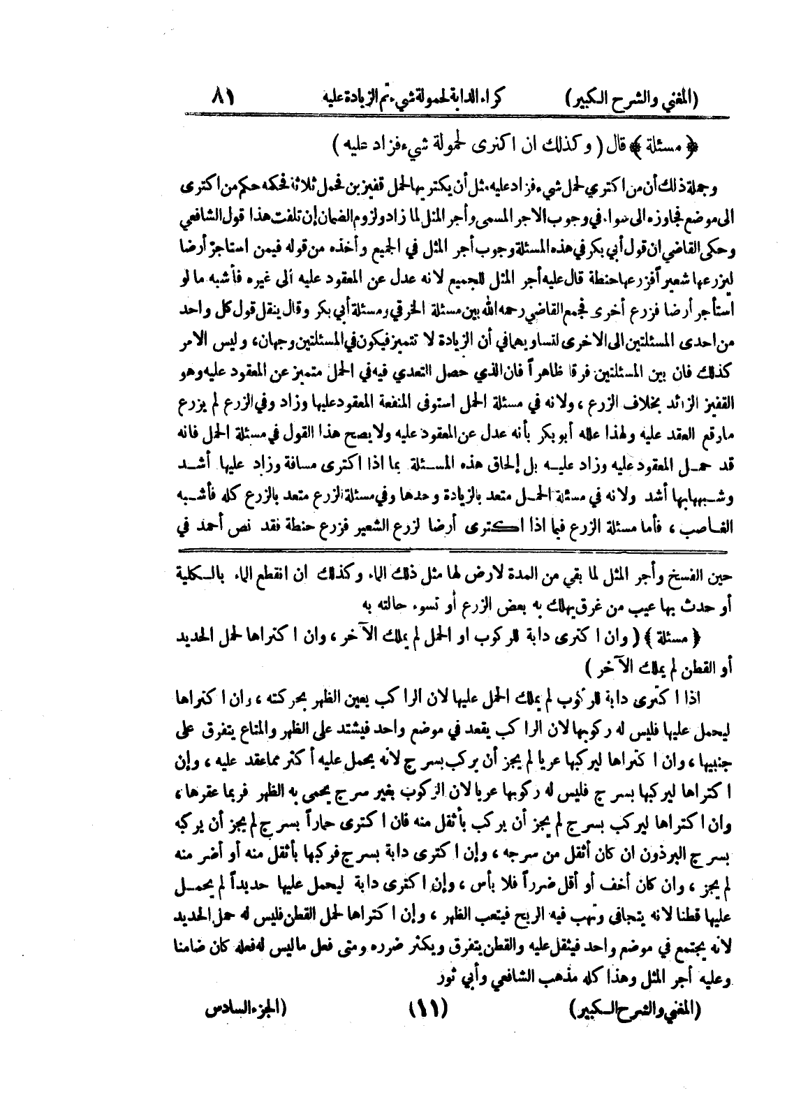حين الفسخ وأجر المثل لما بقي من المدة لأرض لها مثل ذلك الماء وكذلك إن انقطع الماء بالكلية أو حدث بها عيب من غرق يهلك به بعض الزرع أو تسوء حالته به * (مسألة) * (وإن اكترى دابة للركوب أو الحمل لم يملك الآخر، وإن اكتراها لحمل الحديد أو القطن لم يملك الآخر) إذا اكترى دابة للركوب لم يملك الحمل عليها لأن الراكب يعين الظهر بحركته، وإن اكتراها ليحمل عليها فليس له ركوبها لأن الراكب يقعد في موضع واحد فيشتد على الظهر والمتاع يتفرق على