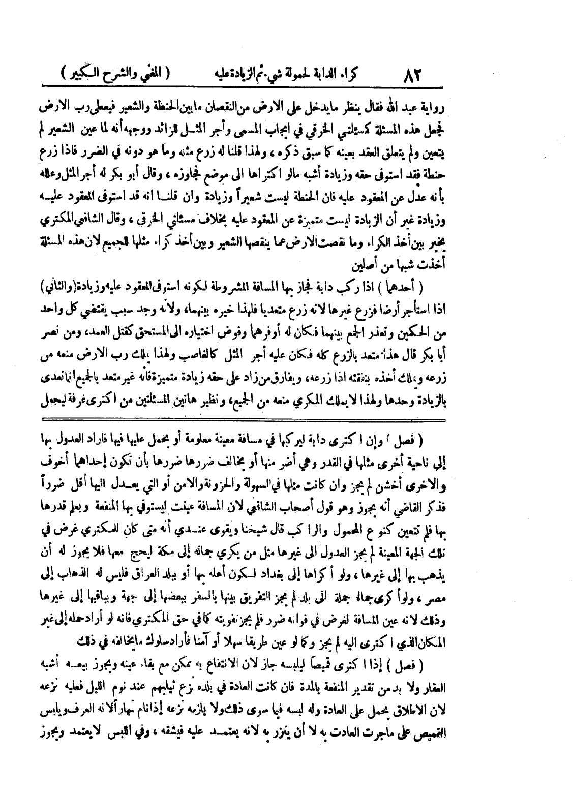 (فصل) وإن اكترى دابة ليركبها في مسافة معينة معلومة أو يحمل عليها فيها فأراد العدول بها إلى ناحية أخرى مثلها في القدر وهي أضر منها أو يخالف ضررها ضررها بأن تكون إحداهما أخوف والأخرى أخشن لم يجز وإن كانت مثلها في السهولة والحزونة والأمن أو التي يعدل إليها أقل ضرراً فذكر القاضي أنه يجوز وهو قول أصحاب الشافعي لان المسافة عينت ليستوفي بها المنفعة ويعلم قدرها بها فلم تتعين كنوع المحمول والراكب قال شيخنا ويقوى عندي أنه متى كان للمكتري غرض في تلك الجهة المعينة لم يجز العدول إلى غيرها مثل من يكري جماله إلى مكة ليحج معها فلا يجوز له أن يذهب بها إلى غيرها، ولو أكراها إلى بغداد لكون أهله بها أو ببلد العراق فليس له الذهاب إلى مصر، ولو أكرى جماله جملة إلى بلد لم يجز التفريق بينها بالسفر ببعضها إلى جهة وبباقيها إلى غيرها وذلك لأنه عين المسافة لغرض في فواته ضرر فلم يجز تفويته كما في حق المكتري فإنه لو أراد حمله إلى غير المكان الذي اكترى إليه لم يجز وكما لو عين طريقا سهلا أو آمنا فأراد سلوك ما يخالفه في ذلك (فصل) إذا اكترى قميصاً ليلبسه جاز لأن الانتفاع به ممكن مع بقاء عينه ويجوز بيعه أشبه العقار ولابد من تقدير المنفعة بالمدة فإن كانت العادة في بلده نزع ثيابهم عند نوم الليل فعليه نزعه لان الإطلاق يحمل على العادة وله لبسه فيما سوى ذلك ولا يلزمه نزعه إذا نام نهاراً لأنه العرف ويلبس