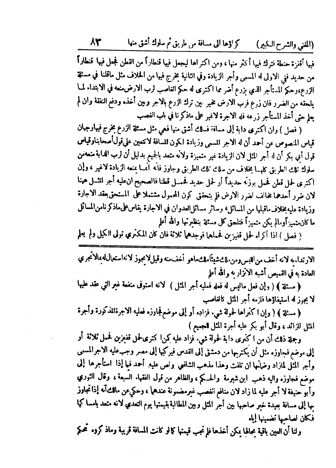 الارتداء به لأنه أخف من اللبس ومن ملك شيئاً ملك ما هو أخف منه وقيل لا يجوز لأنه استعمال له بما لا تجري العادة به في القميص أشبه الاتزار به والله أعلم * (مسألة) * (وإن فعل ما ليس له فعله فعليه أجر المثل) لأنه استوفى منفعة غير التي عقد عليها لا يجوز له استيفاؤها فلزمه أجر المثل كالغاصب * (مسألة) * (وإن اكتراها لحمولة شئ فزاده أو إلى موضع فجاوزه فعليه الأجرة المذكورة وأجرة المثل للزائد، وقال أبو بكر عليه أجرة المثل للجميع) وجملة ذلك أن من اكترى دابة لحمولة شئ فزاد عليه كمن اكترى لحمل قفيزين فحمل ثلاثة أو إلى موضع فجاوزه مثل أن يكتريها من دمشق إلى القدس فيركبها إلى مصر وجب عليه الأجر المسمى وأجر المثل لما زاد وضمانها إن تلفت وهذا مذهب الشافعي ونص عليه أحمد فيما إذا استأجرها إلى موضع فجاوزه وإليه ذهب ابن شبرمة والحكم، والظاهر من قول الفقهاء السبعة، وقال الثوري وأبو حنيفة لا أجر عليه لما زاد لأن منافع الغصب غير مضمونة عندهما، وحكي عن مالك أنه إذا تجاوز بها إلى مسافة بعيدة خير صاحبها بين أجر المثل وبين المطالبة بقيمتها يوم التعدي لأنه متعدى بإمساكها فكان لصاحبها تضمينها إياه ولنا أن العين باقية بحالها يمكن أخذها فلم تجب قيمتها كما لو كانت المسافة قريبة وما ذكروه تحكم