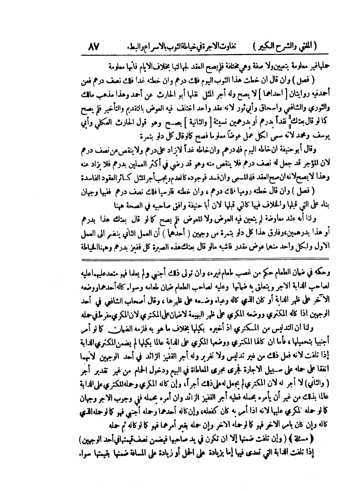ولنا أن التدليس من المكتري إذ أخبره بكيلها بخلاف ما هو به فلزمه الضمان كما لو أمر أجنبيا بتحميلها، فأما إن كالها المكتري ووضعها المكري على الدابة عالما بكيلها لم يضمن المكتري الدابة إذا تلفت لأنه فعل ذلك من غير تدليس ولا تغرير وله أجر القفيز الزائد في أحد الوجهين لأنهما اتفقا على حمله على سبيل الإجارة فجرى مجرى المعاطاة في البيع ودخول الحمام من غير تقدير أجر (والثاني) لا أجر له لأن المكتري لم يجعل له على ذلك أجراً، وإن كاله المكري وحمله المكتري على الدابة عالما بذلك من غير أن يأمره بحمله فعليه أجر القفيز الزائد وإن أمره بحمله ففي وجوب الأجر وجهان كما لو حمله المكري عليها لأنه إذا أمر به كان كفعله، وإن كاله أحدهما وحمله أجنبي فهو كما لو حمله الذي كاله وإن كان بأمر الآخر فهو كما لو حمله الآخر وإن حمله بغير أمرهما فهو كما لو كاله ثم حمله * (مسألة) * (وإن تلفت ضمنها إلا أن تكون في يد صاحبها فيضمن نصف قيمتها في أحد الوجهين) إذا تلفت الدابة التي تعدى فيها إما بزيادة على الحمل أو زيادة على المسافة ضمنها بقيمتها سواء
