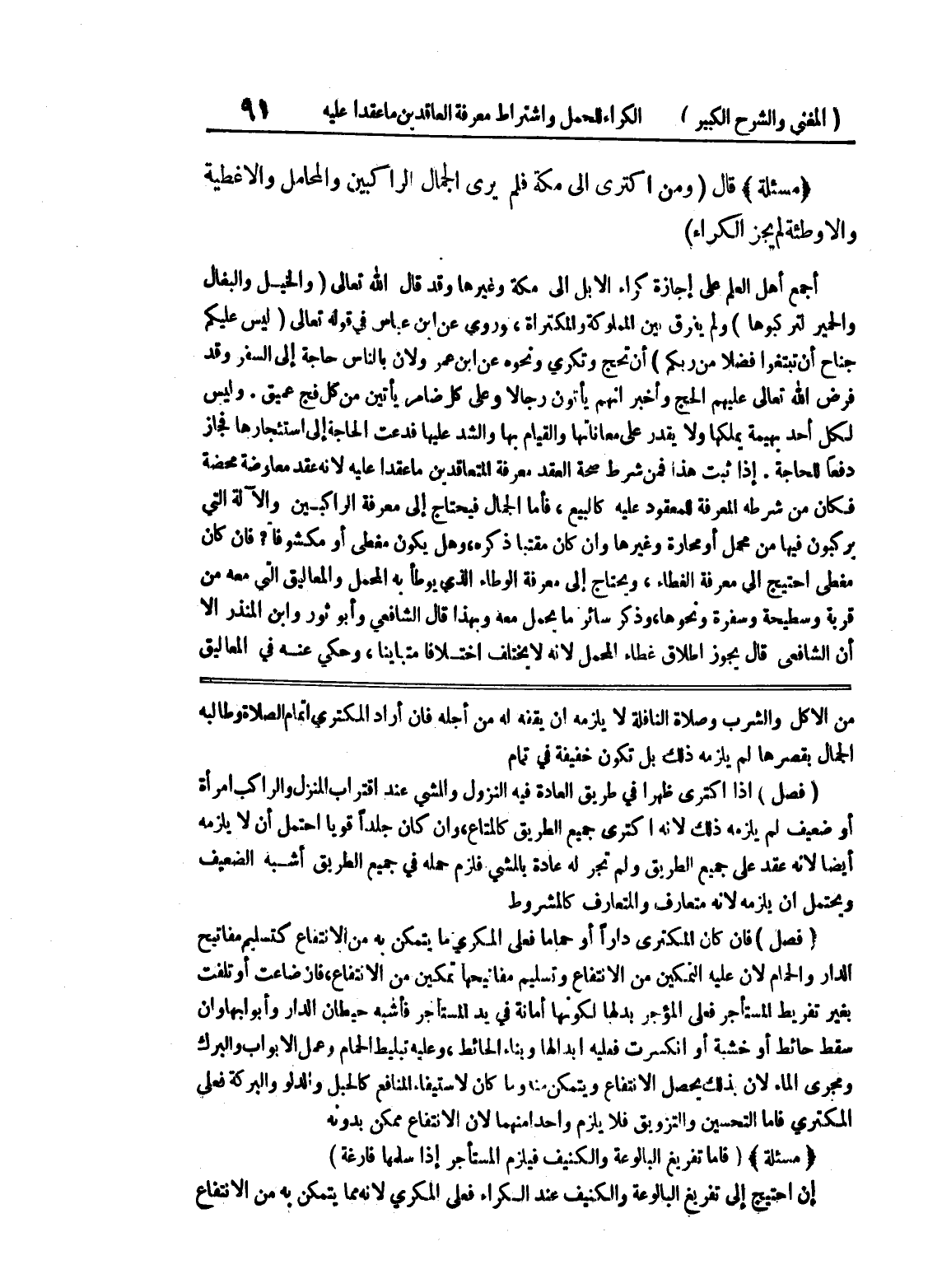 من الأكل والشرب وصلاة النافلة لا يلزمه أن يقفه له من أجله فإن أراد المكتري إتمام الصلاة وطالبه الجمال بقصرها لم يلزمه ذلك بل تكون خفيفة في تمام (فصل) إذا اكترى ظهرا في طريق العادة فيه النزول والمشي عند اقتراب المنزل والراكب امرأة أو ضعيف لم يلزمه ذلك لأنه اكترى جميع الطريق كالمتاع، وإن كان جلداً قويا احتمل أن لا يلزمه أيضاً لأنه عقد على جميع الطريق ولم تجر له عادة بالمشي فلزم حمله في جميع الطريق أشبه الضعيف ويحتمل أن يلزمه لأنه متعارف والمتعارف كالمشروط (فصل) فإن كان المكتري داراً أو حماما فعلى المكري ما يتمكن به من الانتفاع كتسليم مفاتيح الدار والحمام لأن عليه التمكين من الانتفاع وتسليم مفاتيحها تمكين من الانتفاع، فإن ضاعت أو تلفت بغير تفريط المستأجر فعلى المؤجر بدلها لكونها أمانة في يد المستأجر فأشبه حيطان الدار وأبوابها وإن
