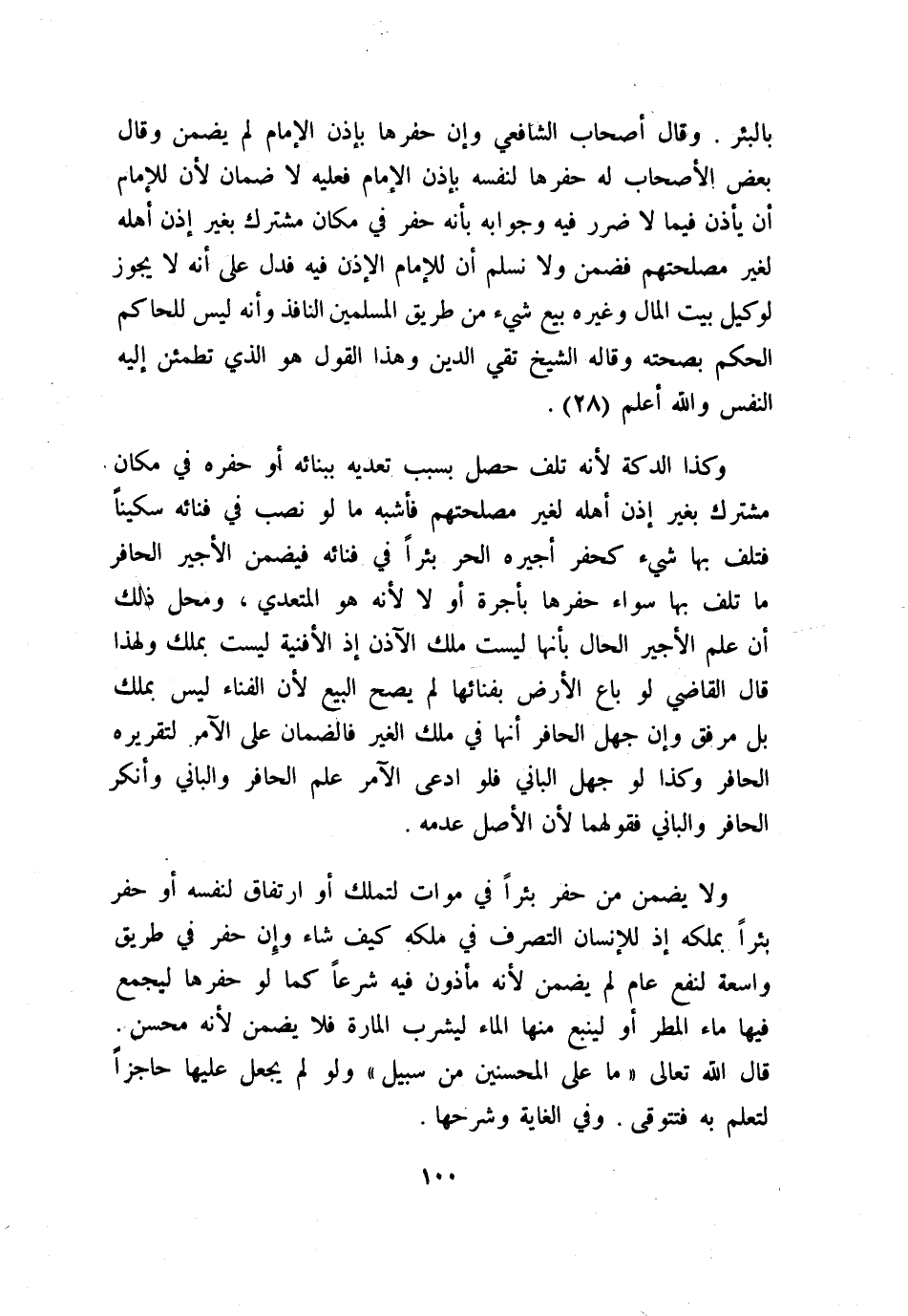 ولا يضمن من حفر بئرًا في موات لتملك أو ارتفاق لنفسه أو حفر بئرًا بملكه إذ للإنسان التصرف في ملكه كيف شاء وإن حفر في طريق واسعة لنفع عام لم يضمن؛ لأنه مأذون فيه شرعًا كما لو حفرها ليجمع فيها ماء المطر أو لينبع منها الماء ليشرب المارة فلا يضمن؛ لأنه محسن، قال الله تعالى: {مَا عَلَى المُحْسِنِينَ مِن سَبِيلٍ} ولو لم يجعل عليها حاجزًا لتعلم به فتتوقى، وفي «الغاية وشرحها» .