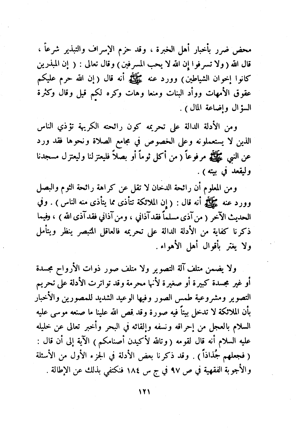 ومن المعلوم أن رائحة الدخان لا تقل عن كراهة رائحة الثوم والبصل، وورد عنه - صلى الله عليه وسلم - أنه قال: «إن الملائكة تتأذى مما يتأذى منه الناس» ، وفي الحديث الآخر: «من آذى مسلمًا فقد آذاني، ومن آذاني فقد آذى الله» ، وفيما ذكرنا كفاية من الأدلة الدالة على تحريمه، فالعاقل المتبصر ينظر ويتأمل ولا يغتر بأقوال أهل الأهواء.