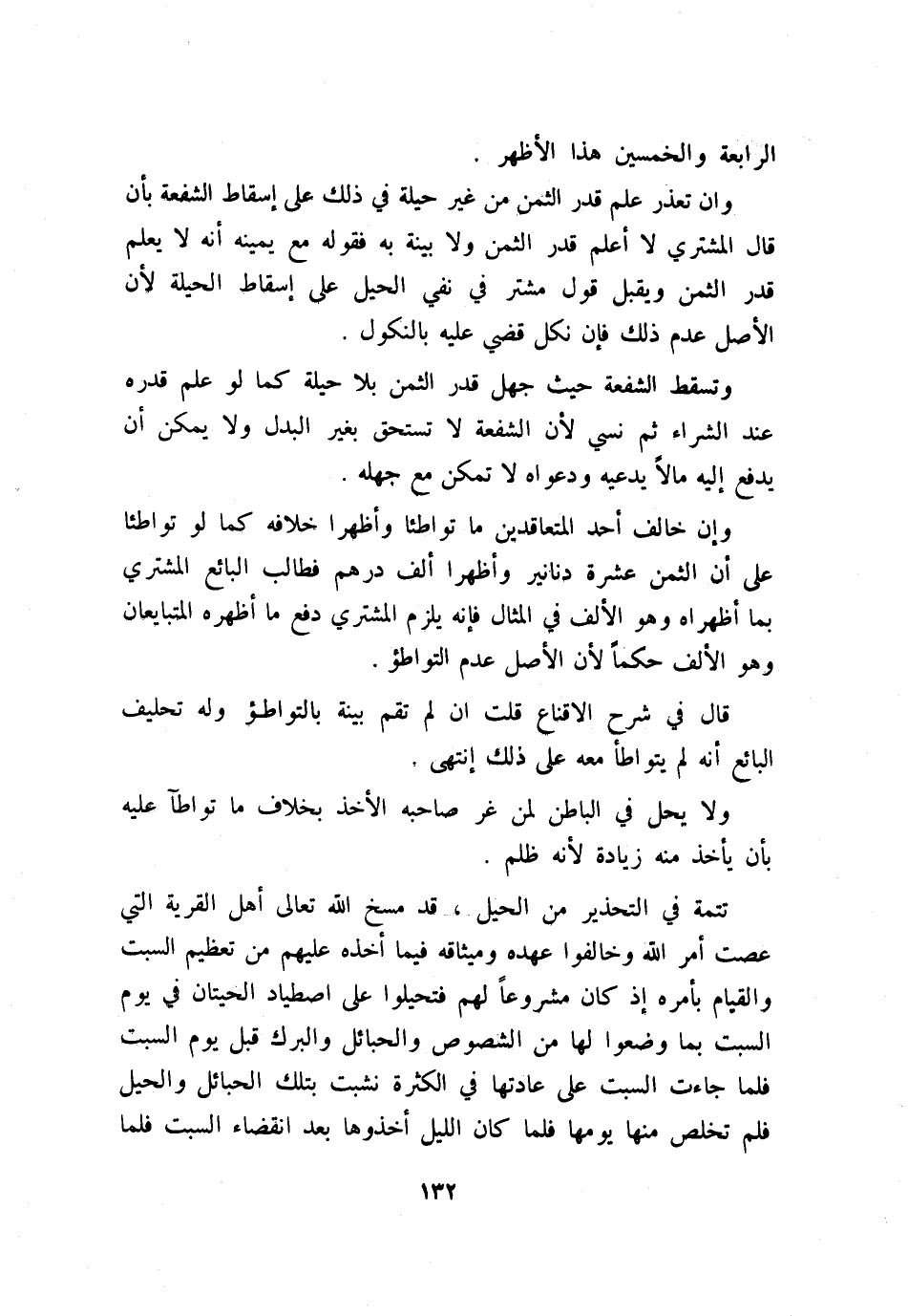 وإن تعذر علم قدر الثمن من غير حيلة في ذلك على إسقاط الشفعة بأن قال المشتري: لا أعلم قدر الثمن ولا بينة به، فقوله مع يمينه أنه لا يعلم قدر الثمن ويقبل قول مشتر في نفي الحيل على إسقاط الحيلة؛ لأن الأصل عدم ذلك فإن نكل قضي عليه بالنكول.