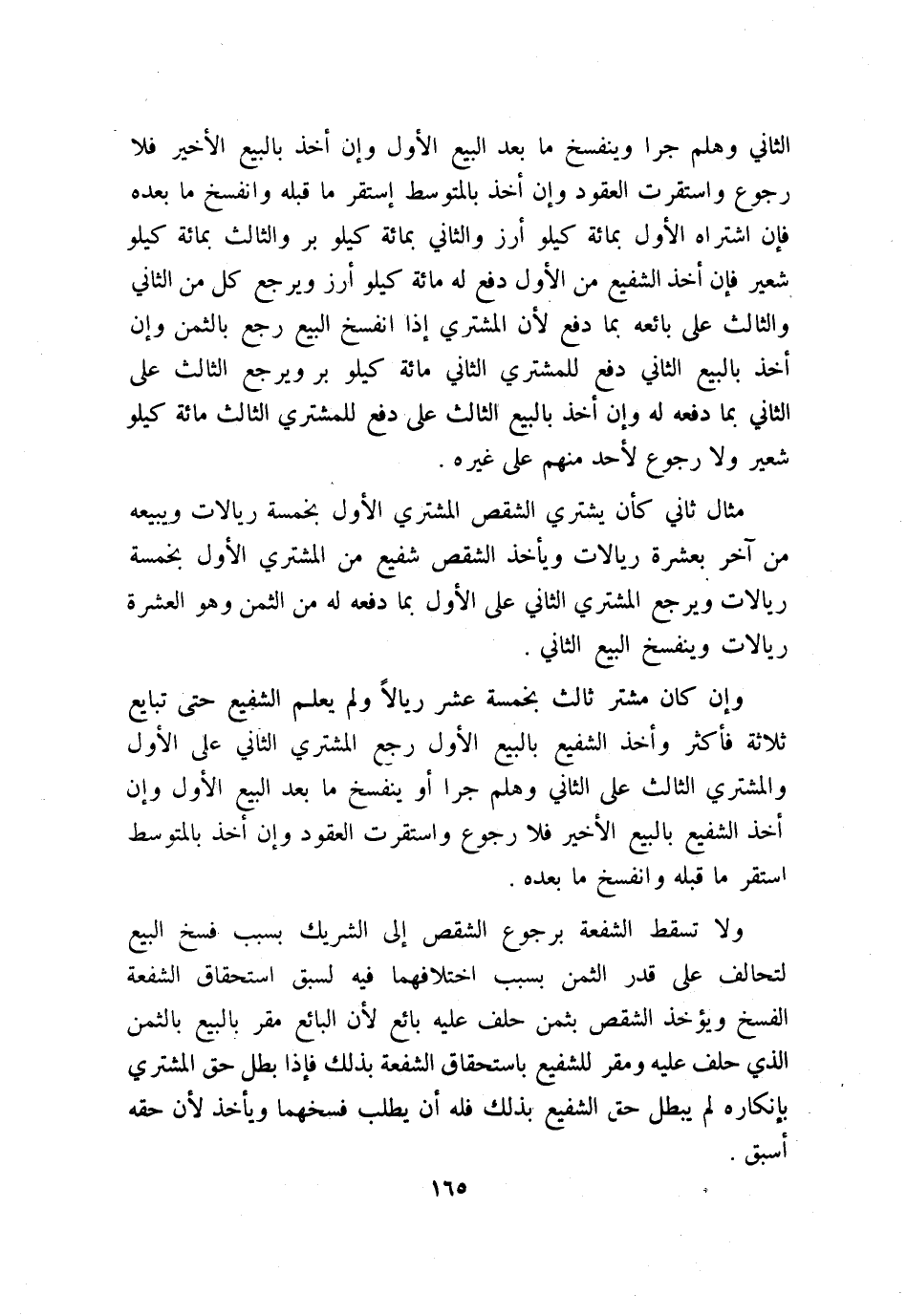مثال ثاني: كأن يشتري الشقص المشتري الأول بخمسة ريالات ويبيعه من آخر بعشرة ريالات ويأخذ الشقص شفيع من المشتري الأول بخمسة ريالات ويرجع المشتري الثاني على الأول بما دفعه له من الثمن وهو العشرة ريالات وينفسخ البيع الثاني.