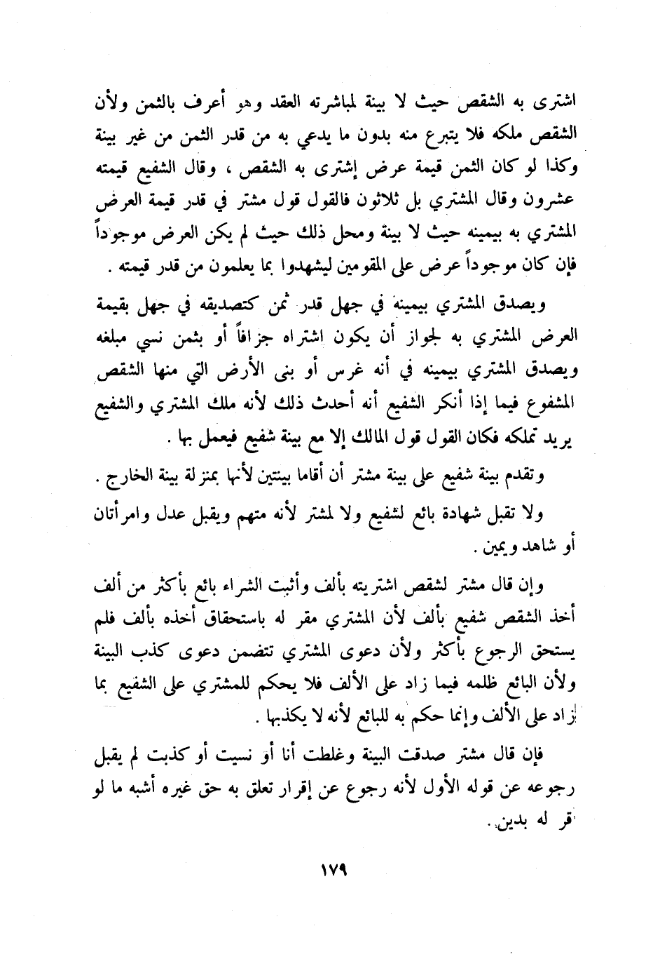اشترى به الشقص حيث لا بينة لمباشرته العقد وهو أعرف بالثمن، ولأن الشقص ملكه فلا يتبرع منه بدون ما يدعي به من قدر الثمن من غير بينة، وكذا لو كان الثمن قيمة عرض إشترى به الشقص، وقال الشفيع: قيمته عشرون، وقال المشتري: بل ثلاثون، فالقول قول مشتر في قدر قيمة العرض المشتري به بيمينه حيث لا بينة ومحل ذلك حيث لم يكن العرض موجودًا، فإن كان موجودًا عرض على المقومين ليشهدوا بما يعلمون من قدر قيمته.