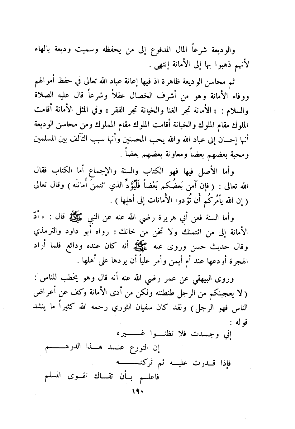 وروى البيهقي عن عمر - رضي الله عنه - أنه قال وهو يخطب للناس: «لا يعجبنكم من الرجل طنطنته؛ ولكن من أدى الأمانة وكف عن أعراض الناس فهو الرجل» ولقد كان سفيان الثوري - رحمه الله - كثيرًا ما ينشد قوله: