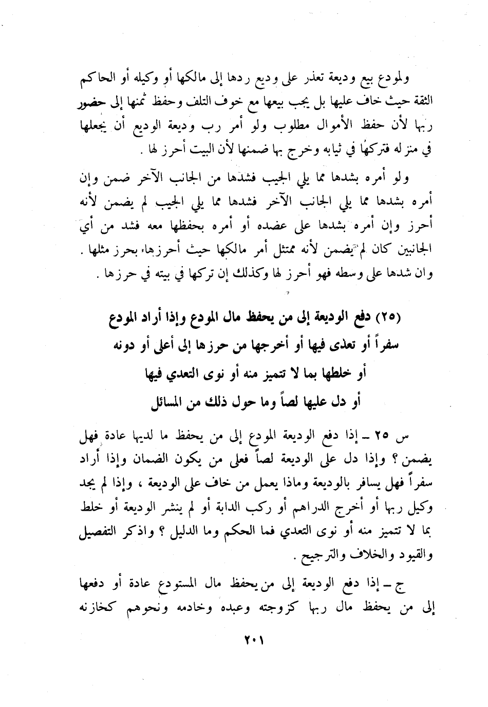 (25) دفع الوديعة إلى من يحفظ مال المودع وإذا أراد المودع سفرًا أو تعدى فها أو أخرجها من حرزها إلى أعلى أو دونه أو خلطها بما لا تتميز منه