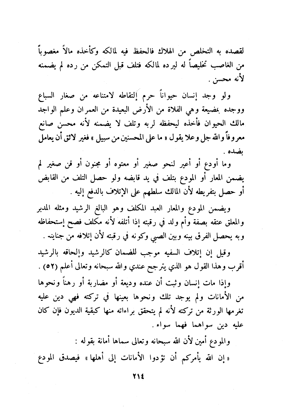 ولو وجد إنسان حيوانًا حرم إلتقاطه لامتناعه من صغار السباع ووجده بمضيعة وهي الفلاة من الأرض البعيدة من العمران وعلم الواجد مالك الحيوان فأخذه ليحفظه لربه وتلف لا يضمنه؛ لأنه محسن صانع معروفًا، والله جل وعلا يقول: {مَا عَلَى المُحْسِنِينَ مِن سَبِيلٍ} فغير لائق أن يعامل بضده.